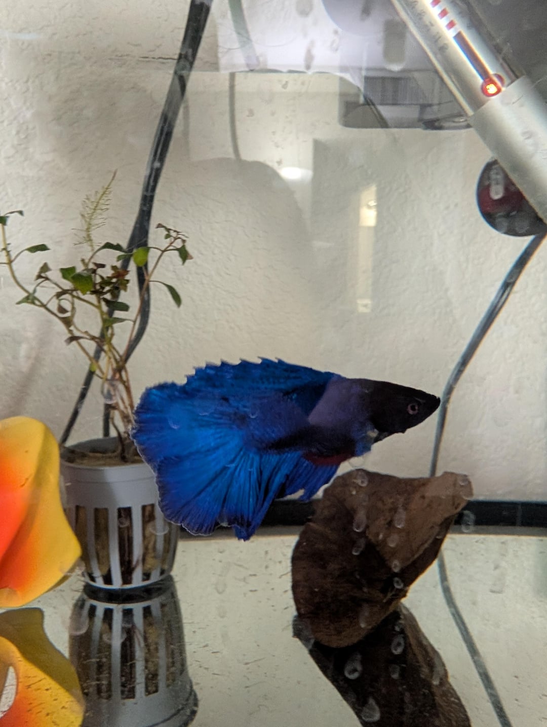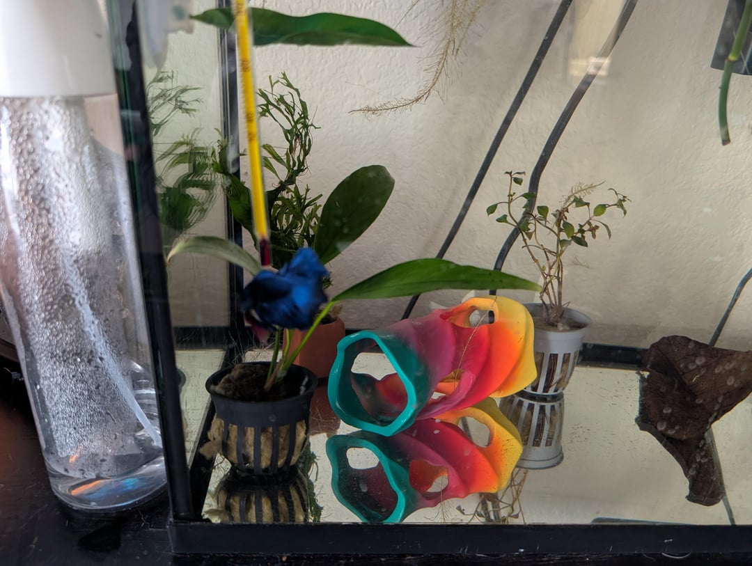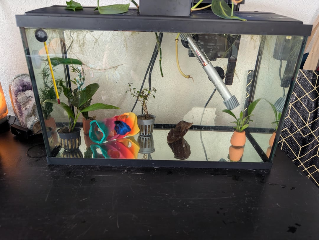 I also noticed yesterday that he had some tears in his fins that did not look like niping, it was 2 long clean cuts so I can only assume one of his silk pants was the culprit. So I order the Indian almond leaves and they arrived this morning, I boiled one for 10 minutes and let it cool completely while I did the 50% water change. Then I added 1 cup of the tea plus the full leave to his tank for the tannins to help with his stuff. His tank is set to 78°f for temperature and his filter is baffled with hella sponge media and he can rest in the flow directly, but it still agitated the surface just enough for oxygenation. Also since obviously he had issues with the silk plants, all have been replaced with live plants. I got a java fern, an annubias, an Amazon sword, and a ludwigia. All are in pots because I don't have substrate. He has a Pothos and philodendron clipping as well to help keep the nitrate under control and he has water lettuce floaters (though those are dying and idk why, I wanted frogbit so I'll probably keep pruning daily until their dead then replace with frogbit).