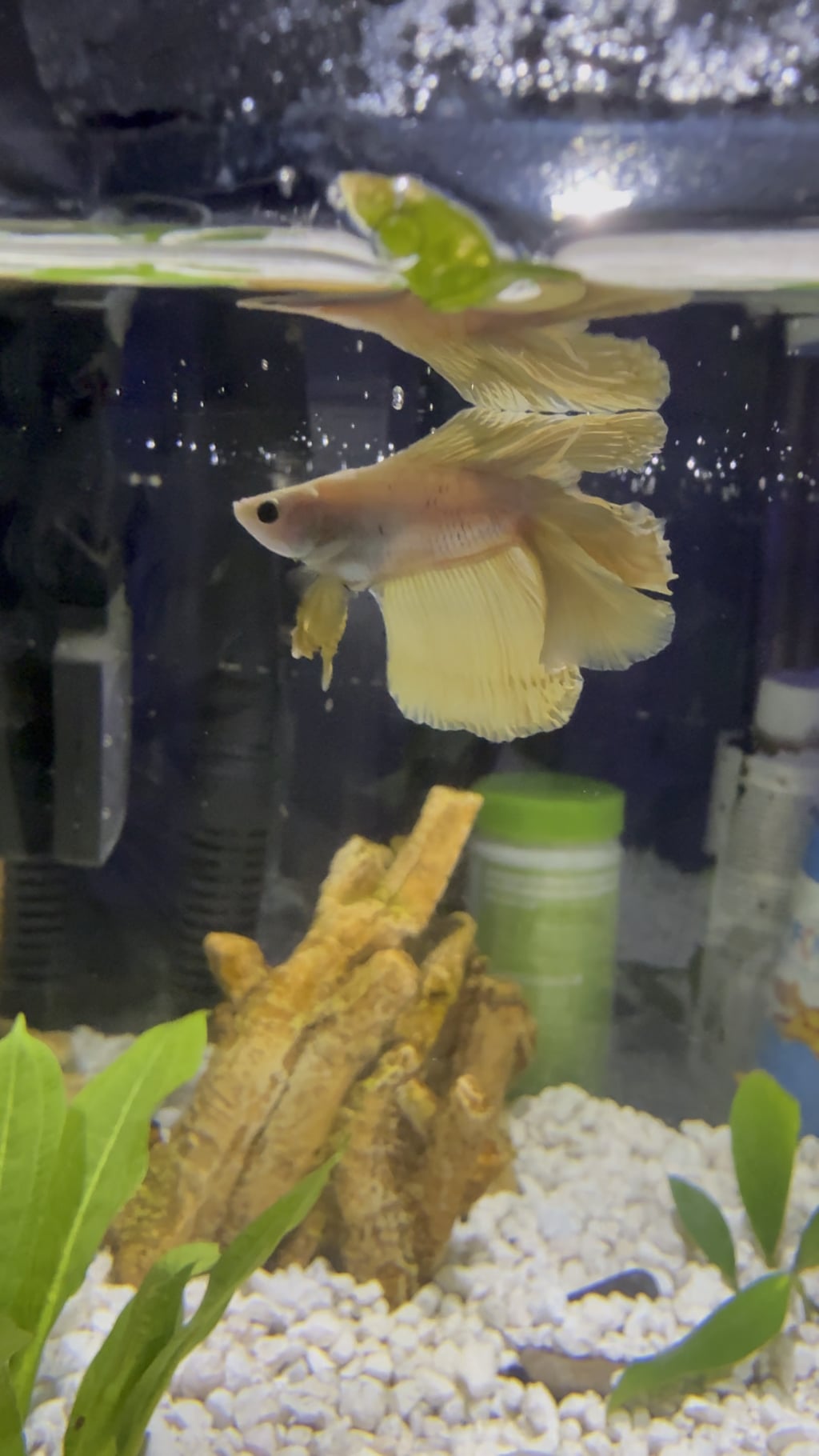 5 gallon tank, heater and filter, the temperature is 78, I checked the water yesterday and everything was good,I’ve had the tank and the fish for a few days,no tank mates,I feed 4 pellets twice a day,I have two live plants, a stone, and drift wood