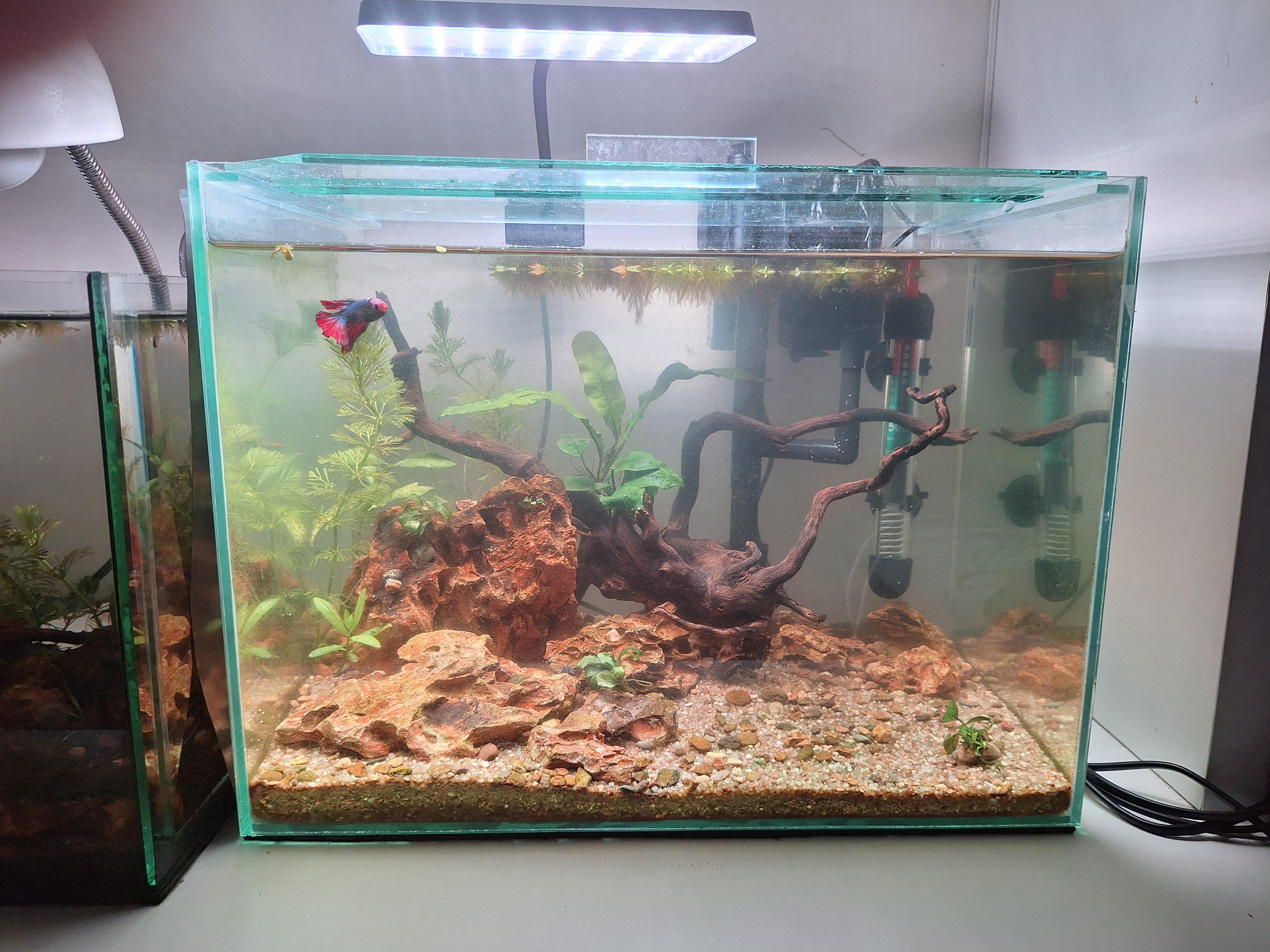 The photo disguises it a bit, but the water in my aquarium is very cloudy. It happened suddenly; I turned off the aquarium light, and after about two hours I noticed the water was cloudy and this was what I saw. The water was crystal clear and suddenly became like this. I'm 95% sure it was a bacterial outbreak due to organic matter, because I overfed the fish, neglected water changes, etc. In short, an excess of organic matter. I'm going to do a 50-70% water change, but I wanted to know if that's what you recommend, if anyone has experienced this before, and how they solved it. The ammonia rose to 0.25 ppm (it was zero) and the nitrite also rose a little. This was probably due to excess organic matter. (Note that this tank is 7 gallons, has 1 betta 2 otocinclus, 4 nerite snails and 3 wild neocaridina, i fed all of them too much)