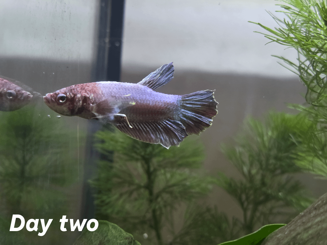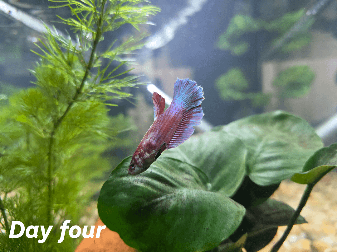 – Two double leaf betta hammocks on each side, high up near the top so he can rest and breathe