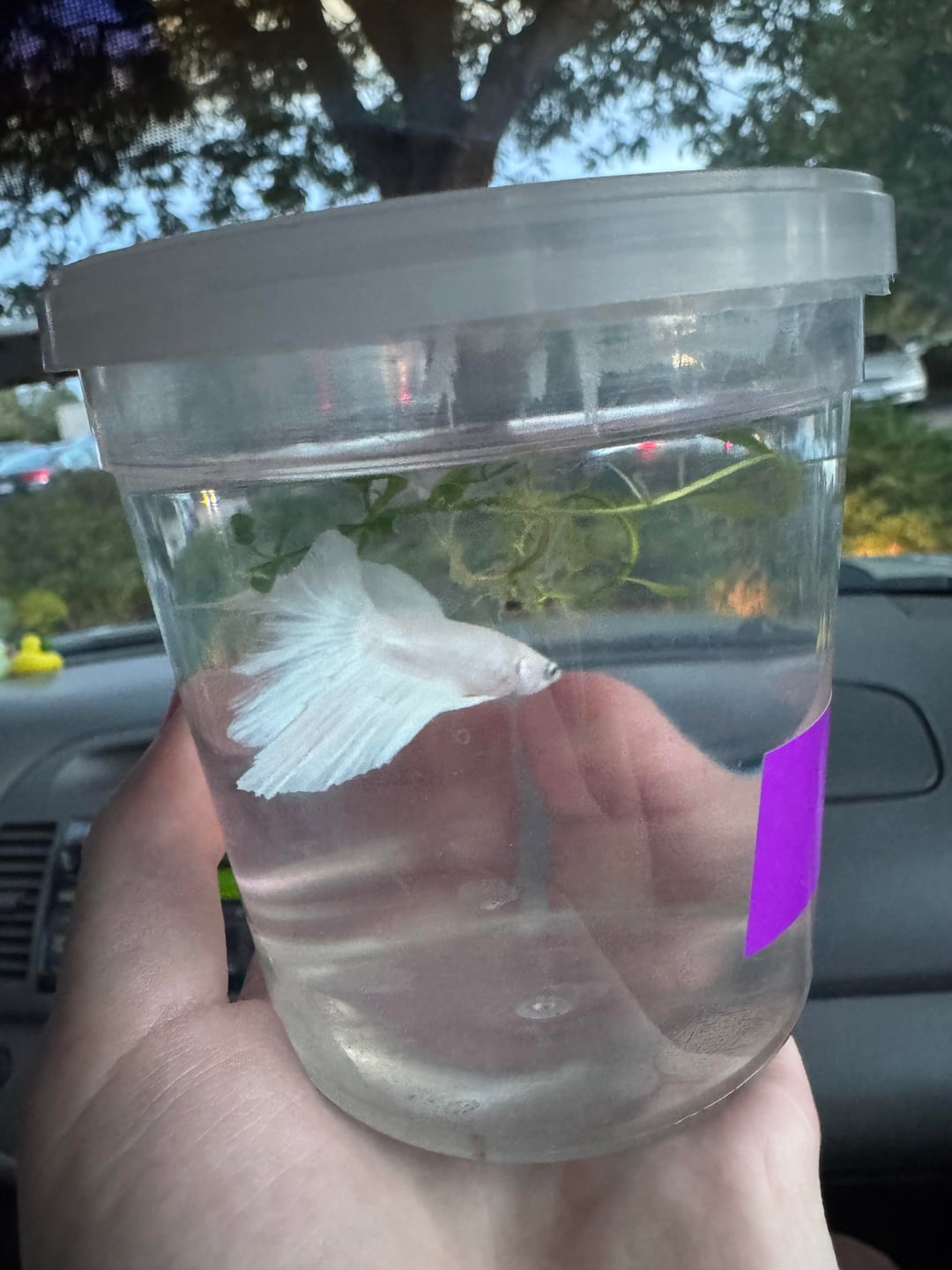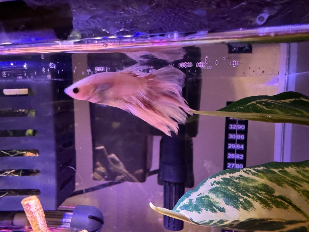 Your boy is developing color! This is often seen when the fish gets out of a cup and into a healthy, happy environment. It may continue to spread or not! Often white bettas will end up with beautiful large amounts of color! I think he will look awesome! Keep doing what you are doing!