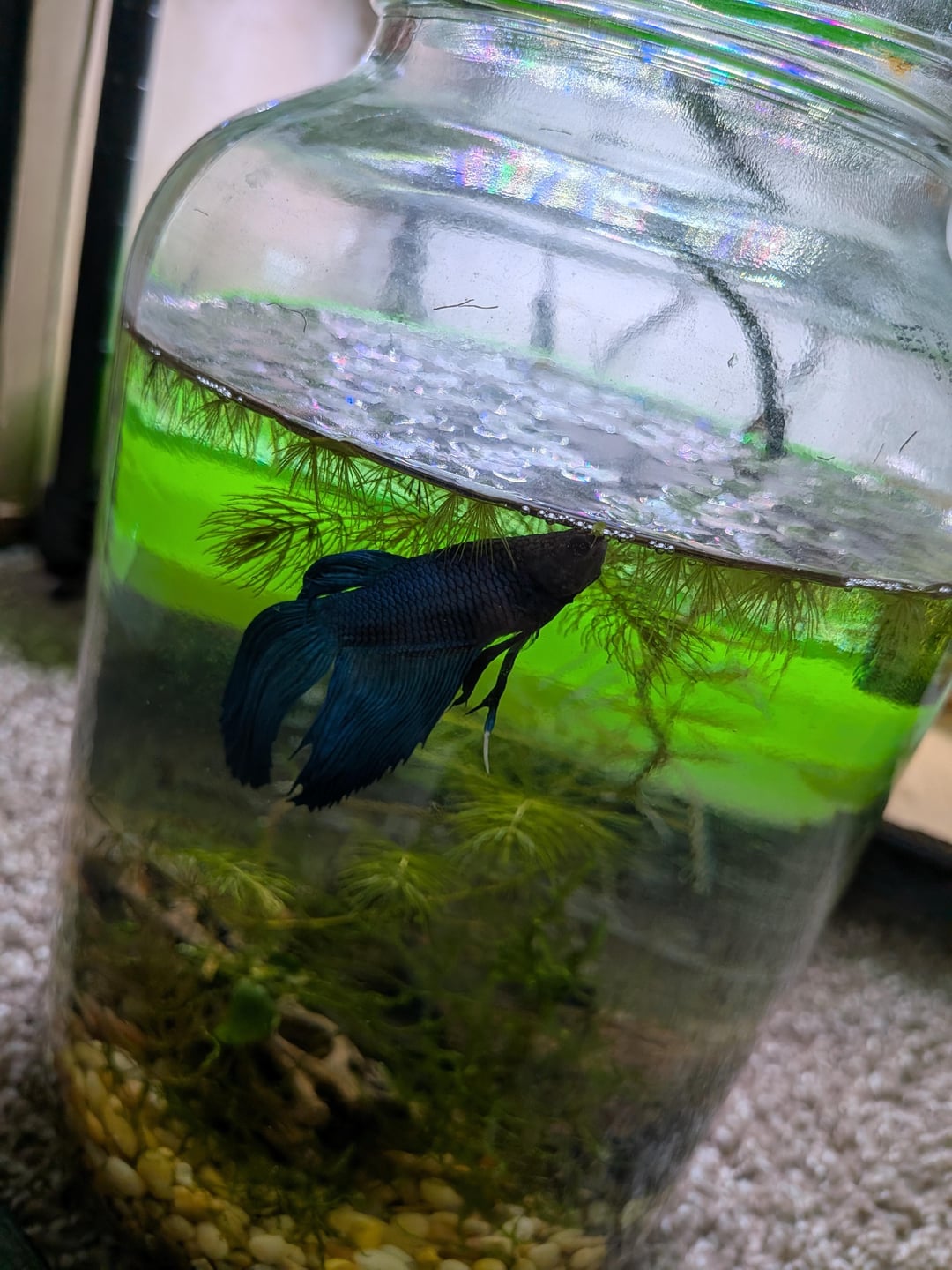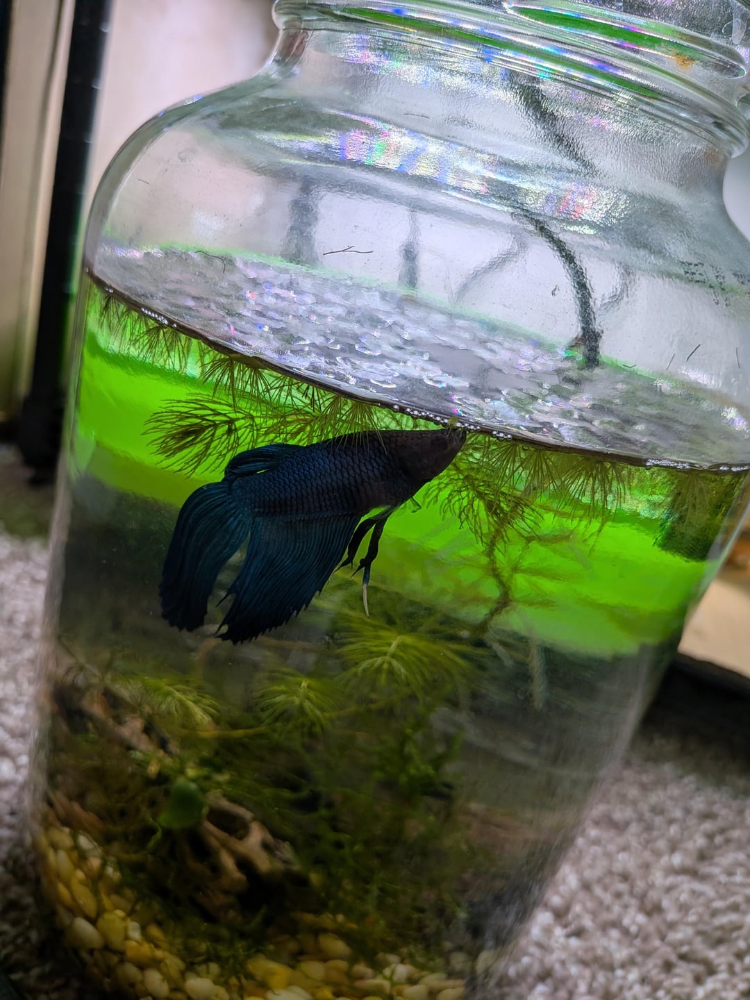 ABOUT HIS SETUP: I promise I am aware it is inadequate. His home is temporary and getting upgraded to 5.5 gallons in a couple weeks(however long it takes to finish its cycle). HIS PARAMETERS ARE FINE(only all caps because I know how y'all are I wanted to make sure you see this). I test for them daily and do water changes. Duckweed(Lemna and Spirodela) and hornwort are being used to help with water quality. Moss is for comfort and the cholla wood and anubias was a betta buddy thing. Seeded this jar with a little mulm as well to help get bacteria going.
