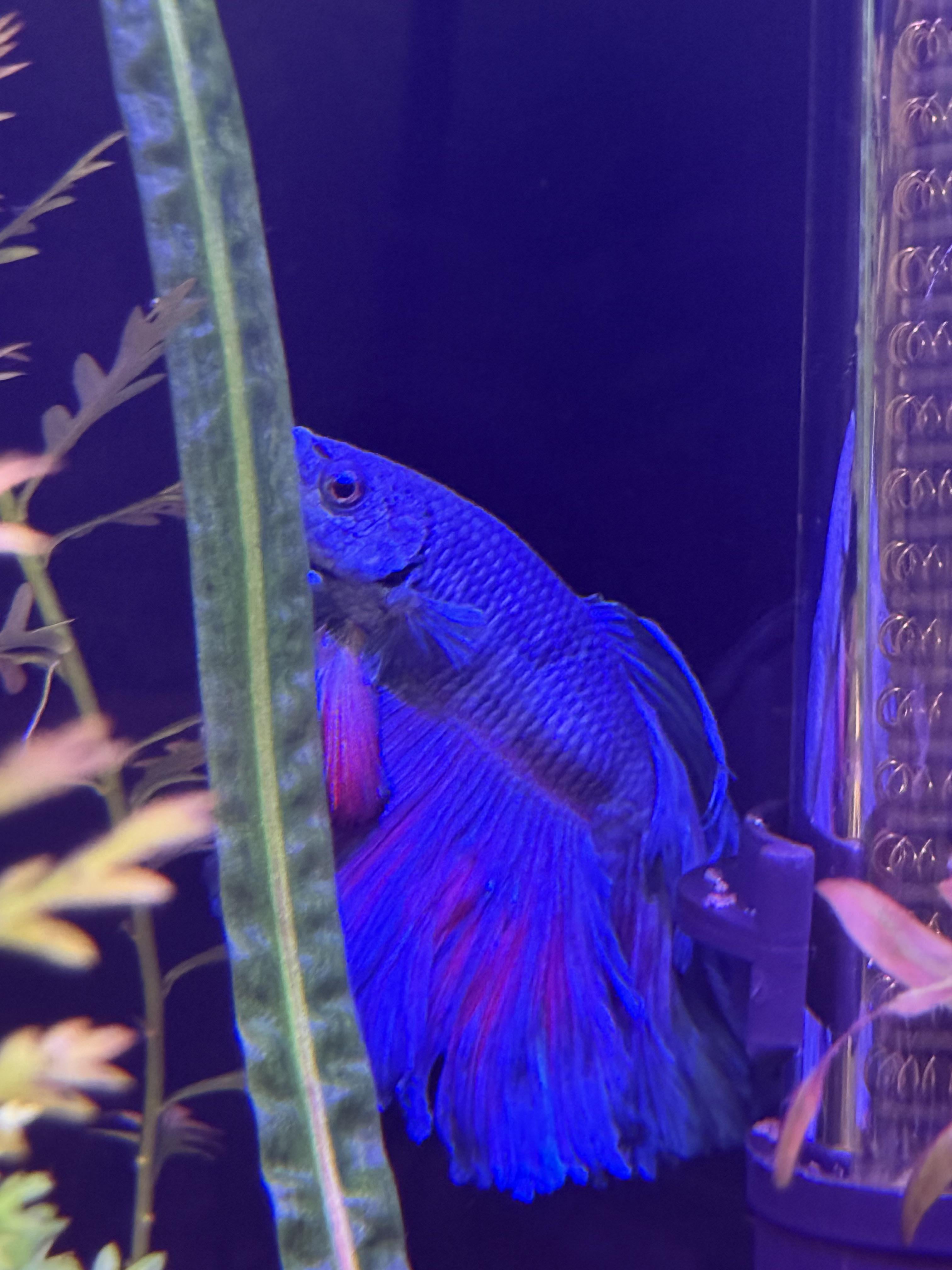 hi! totally normal for him to be stressed in a new environment although i’m not too sure about that bump so i would keep an eye on it. i feed my betta fluval bug bite flakes/ pellets, freeze dried blood worms, and frozen brine shrimp, brine shrimp is more of a “treat” to bettas, so one or twice a week will suffice.