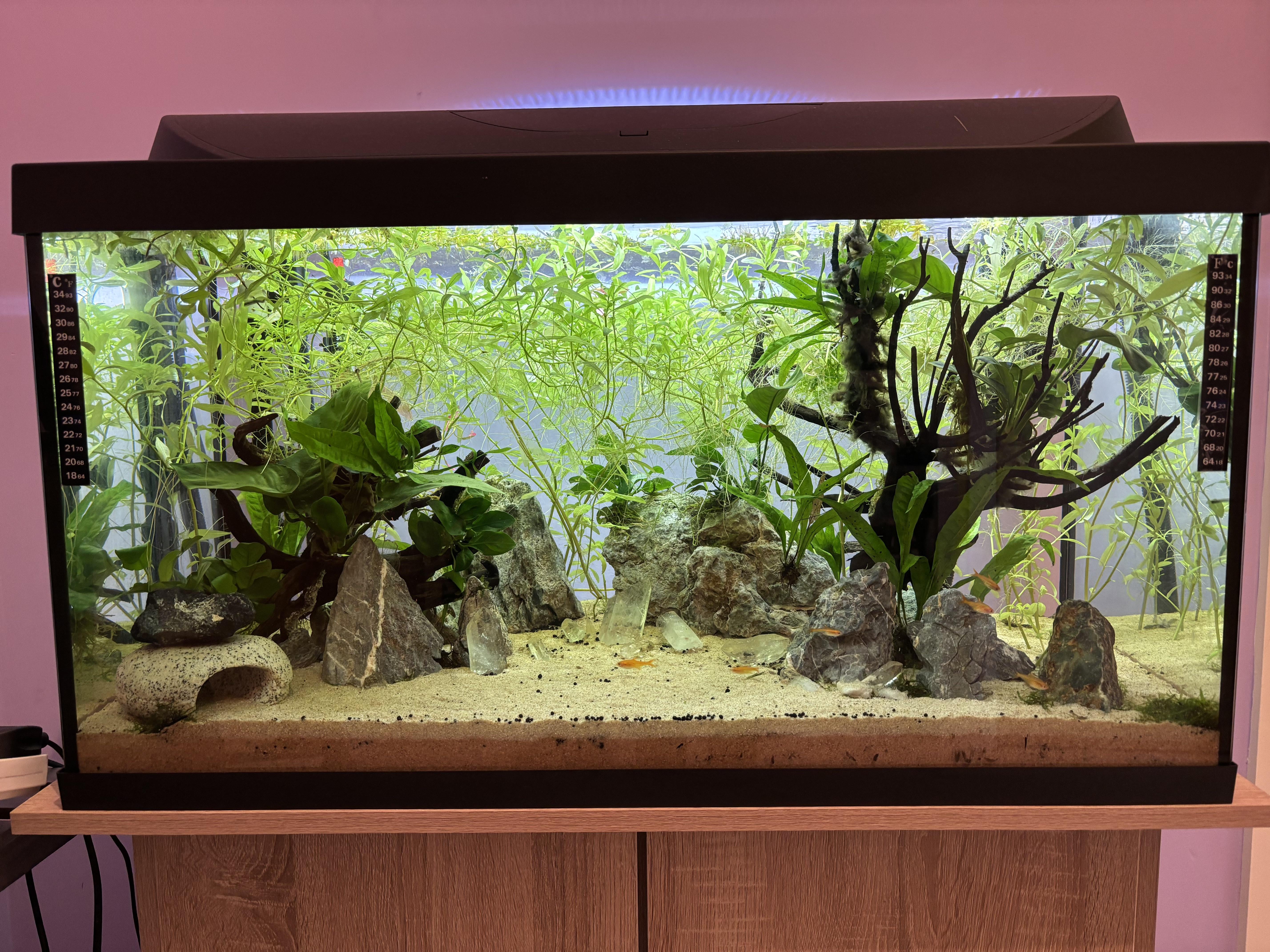 I currently have 7 peppered corydoras, 8 ember tetras and 10 celestial pearl danios (and a few pond snails that hitched a ride on the plants). Its a 105 litre tank. Wanted a nice attention grabbing fish for the centerpiece. Was originally thinking of a gourami but I think the CPDs are too small and will probably become lunch. Any ideas?