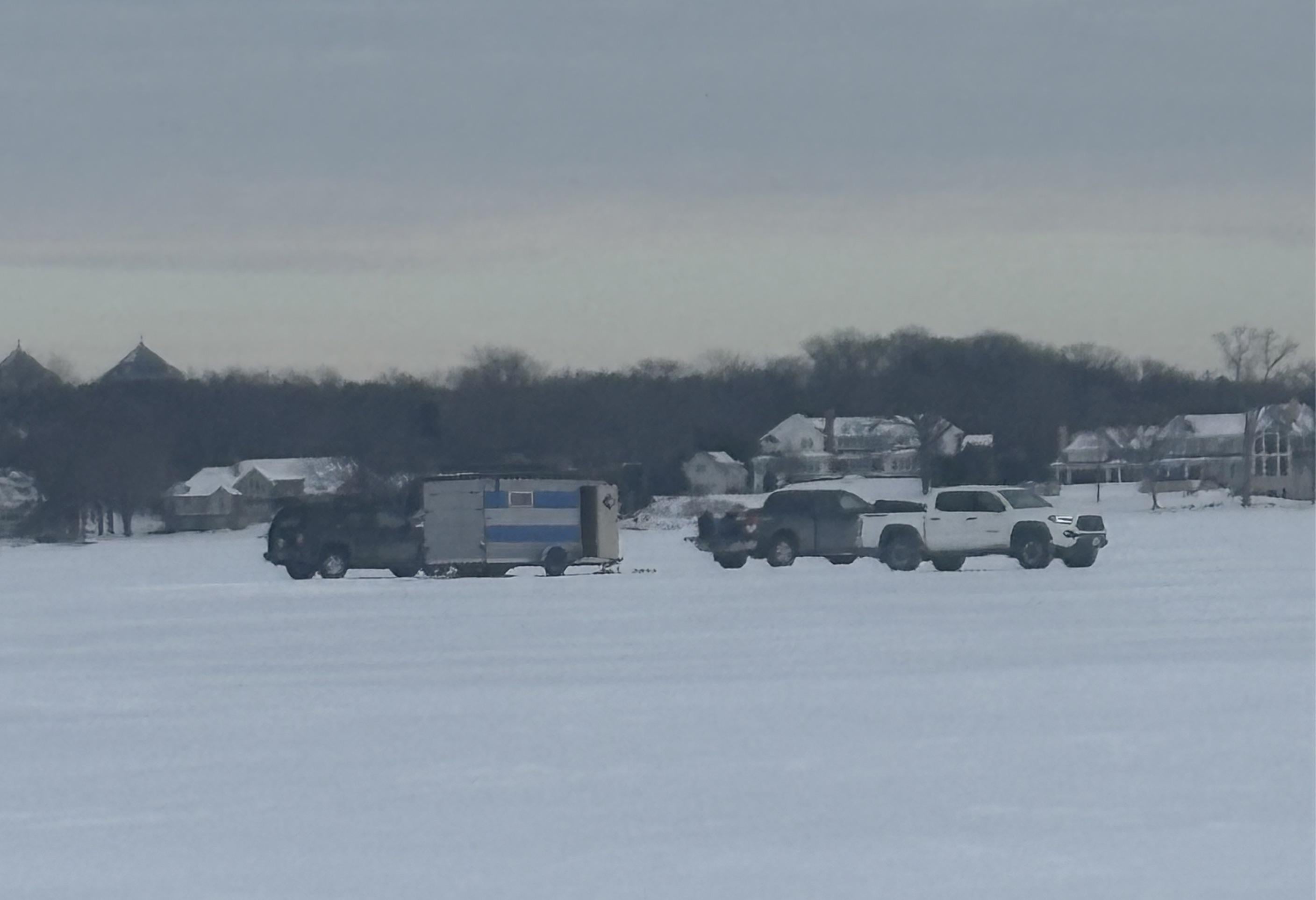 Had to do a double take when i just took the snowmobile out to my tent and see 3 rigs and a shanty on 10 inches of ice. Surprised they didn’t fall through with those balls of steel. Wayzata bay, Lake Minnetonka, Mn
