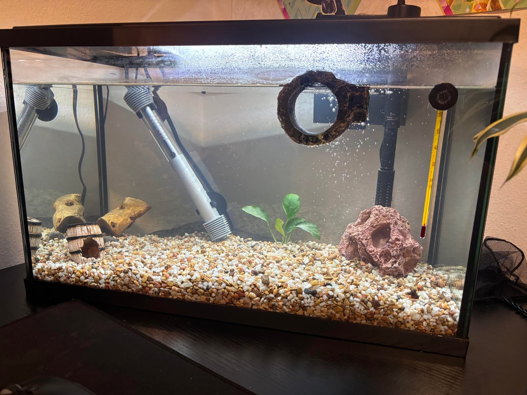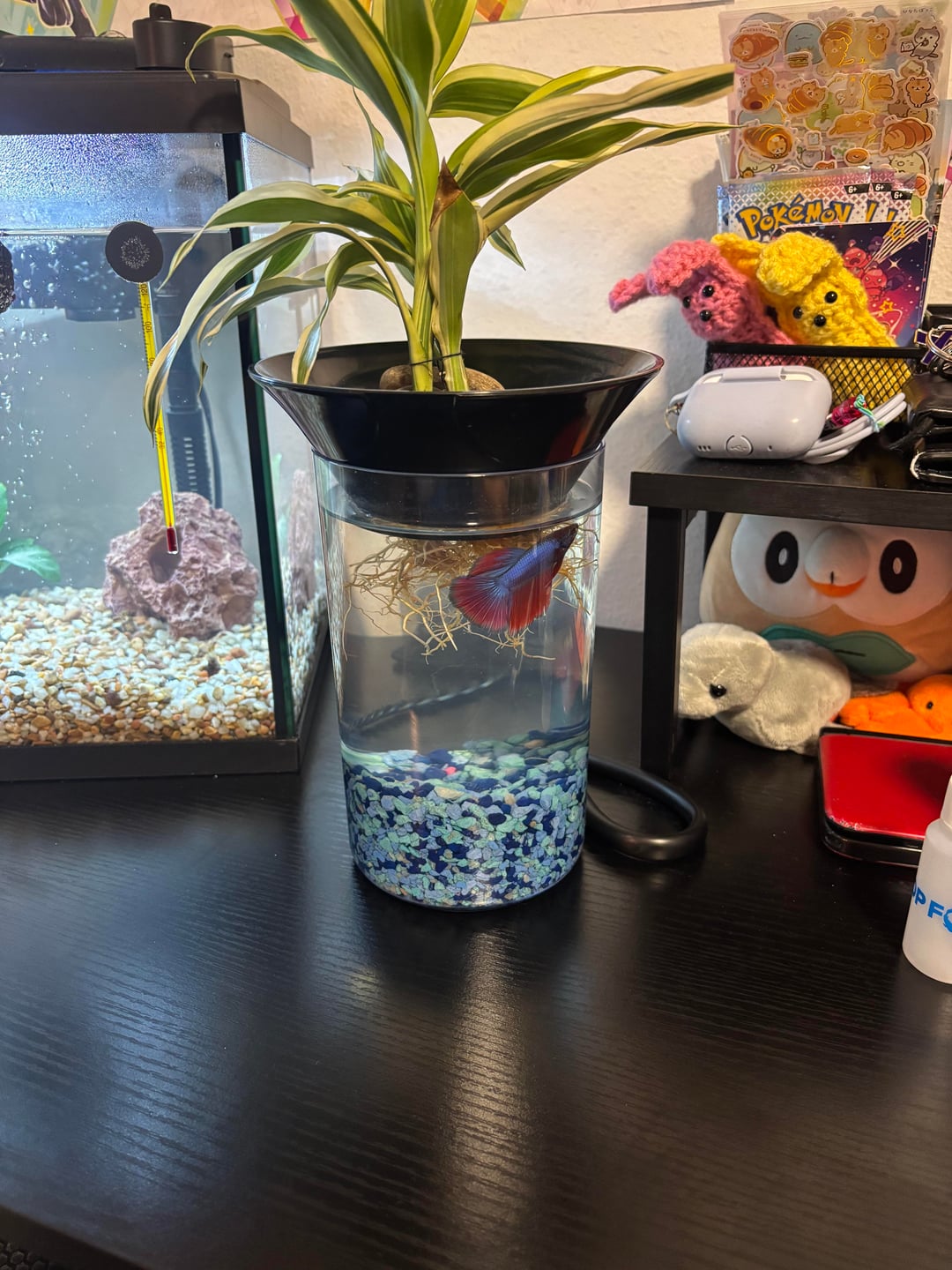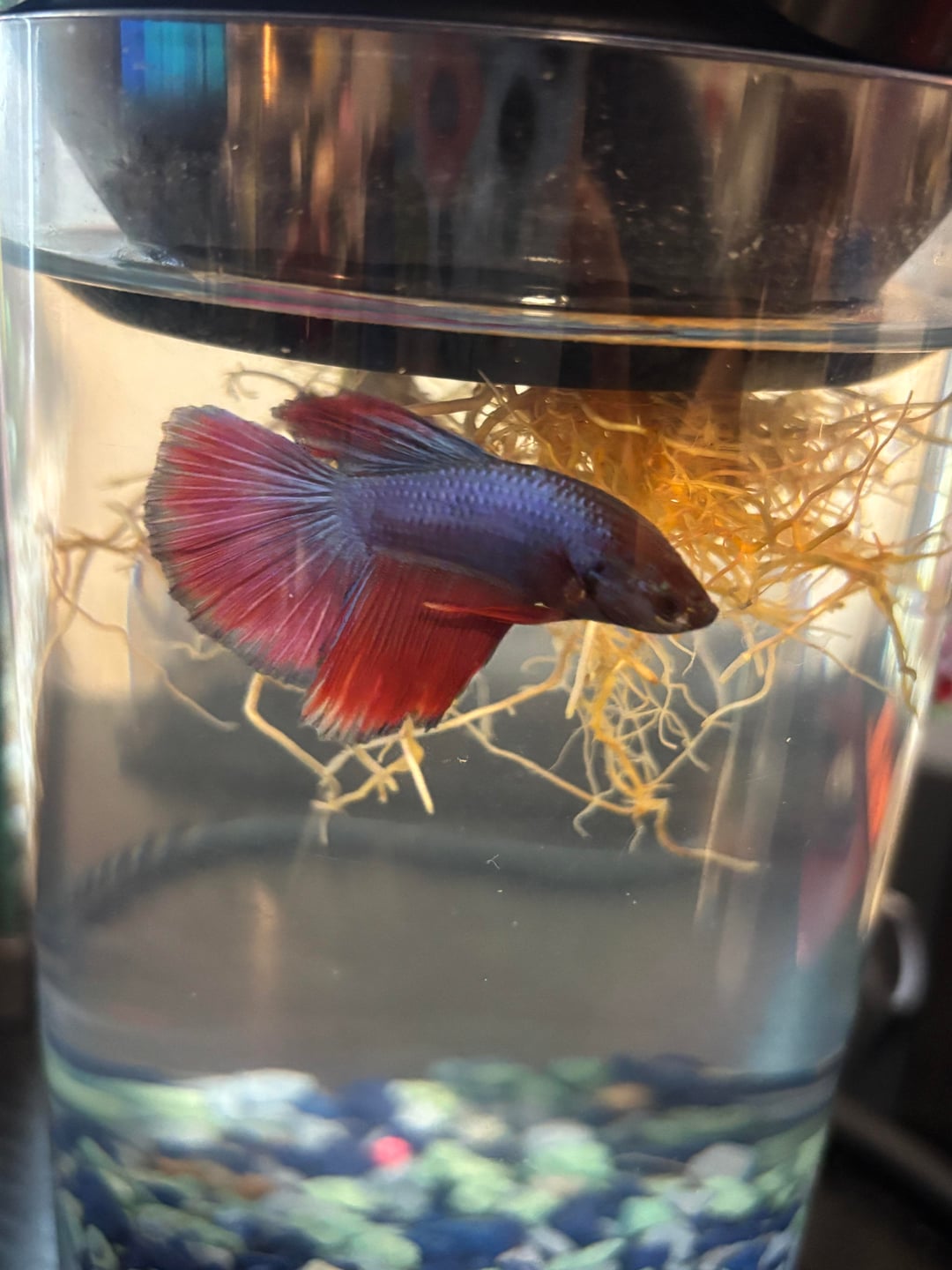 Right now I’m leaning towards getting more plants and possibly some snails to do a fish-in cycle so I can get him out of his small enclosure. Right now I’ve got one plant in the tank, and I might be able to rig the plant on the .5g tank to fit in the extra space next to the water filter on the lid. As well as a few bulb plant starts from petsmart.