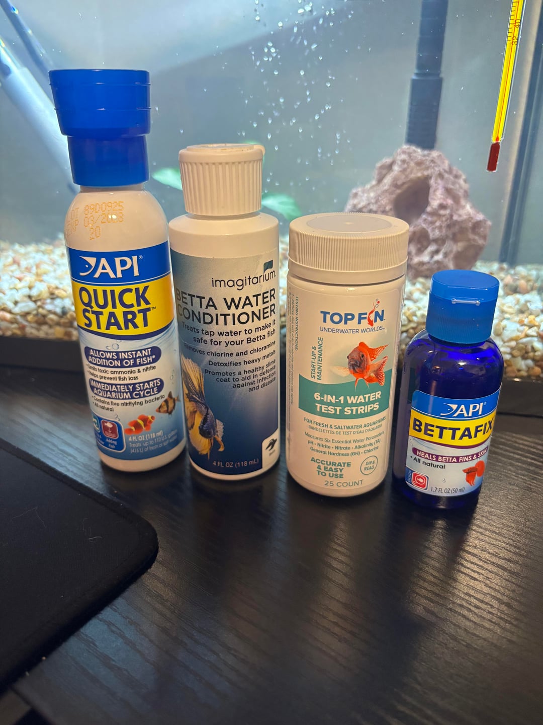 I was gifted a betta for Christmas, along with this .5 gallon cup and a plant to go on top of it. I bought an API 10 gallon start kit with a heater and filter. I’ve added API quick start and imagitarium water conditioner. I believe I need to either get ammonia pellets, add fish food, or add the fish to feed the bacteria.