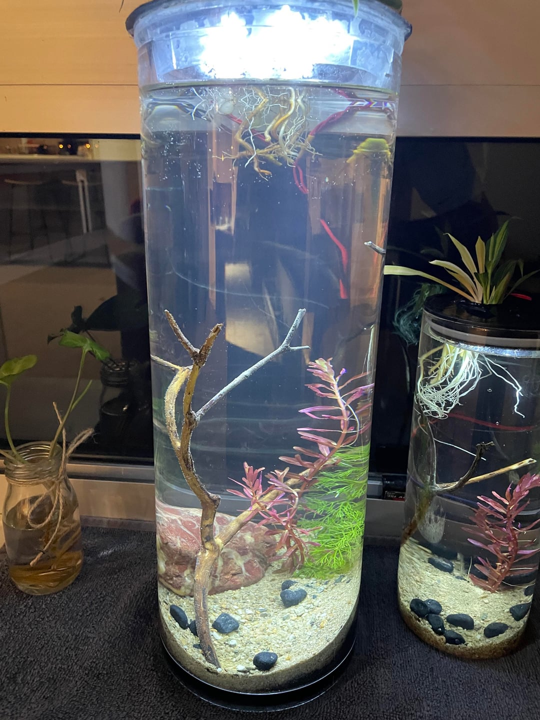 Larger tank has propagating sand substrate with fluval aqua soil, second tank has just propagating sand with root tabs for the rotala plants. Just waiting for the tanks to cycle before water testing