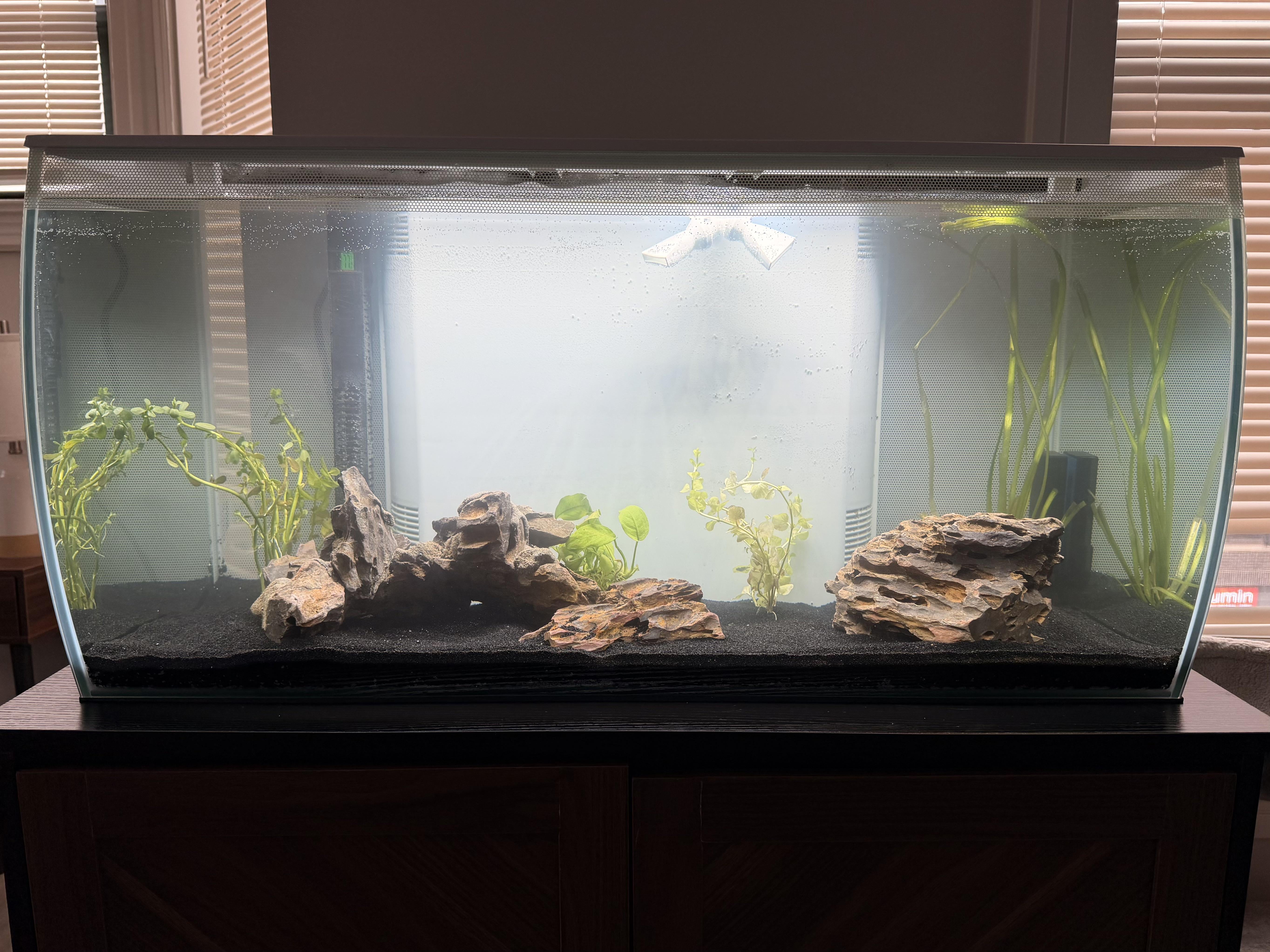 You got a good tank to start with! It looks like my first tank when I started. Congratulations 🎊 may your Journey be filled with the excitement it brings. Don’t get discouraged when problems happen it’s part of the process. There will be good days and in the beginning more bad lol always reach out to the community with any questions and for tips and tricks. I’ve learned so much in the past year I never thought I’d know. Scape scape scape! If you ever need any plants I have a ton!