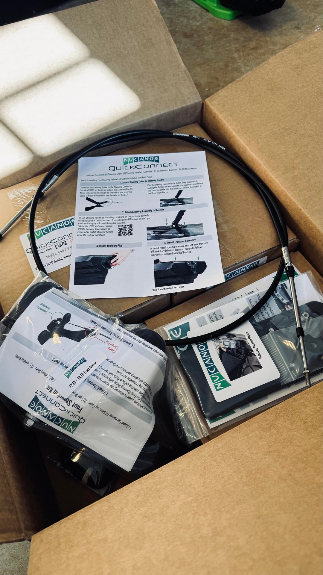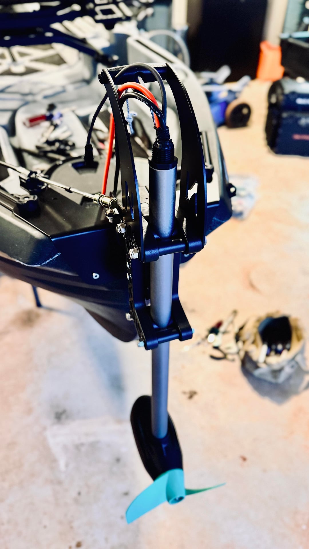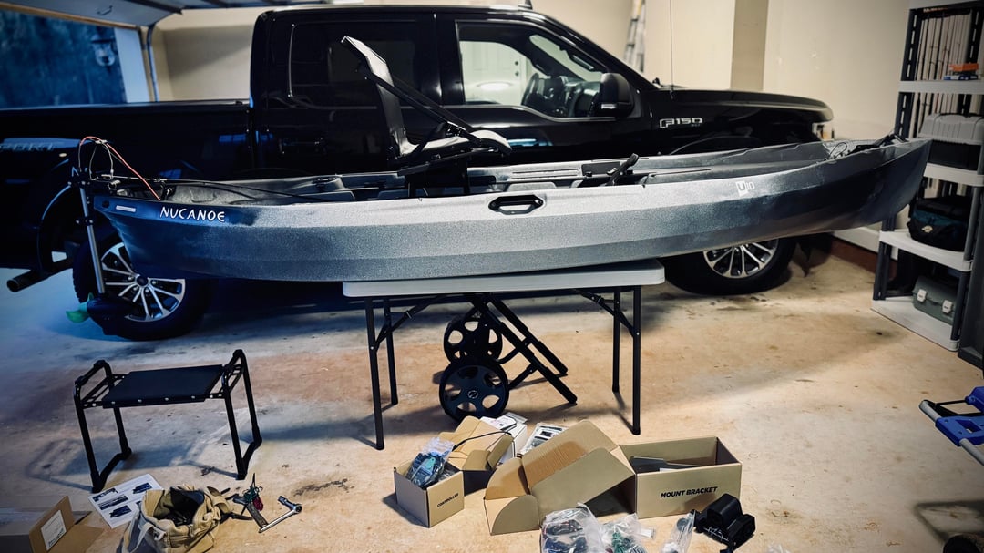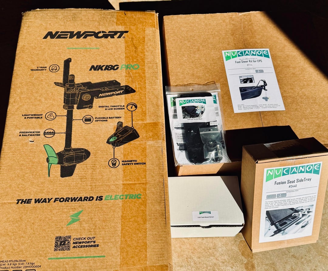 All the pieces and parts finally started showing up and I'm slowly cobbling together my dream machine. So far I've installed the Fusion side tray and throttle mount, transom mount, foot steering controls and most of the motor. Still need to finish the motor, install the motor lift pulley system, throttle, battery and wiring. I'm hoping to take it out on a shake down trip in a couple of days. Good times!