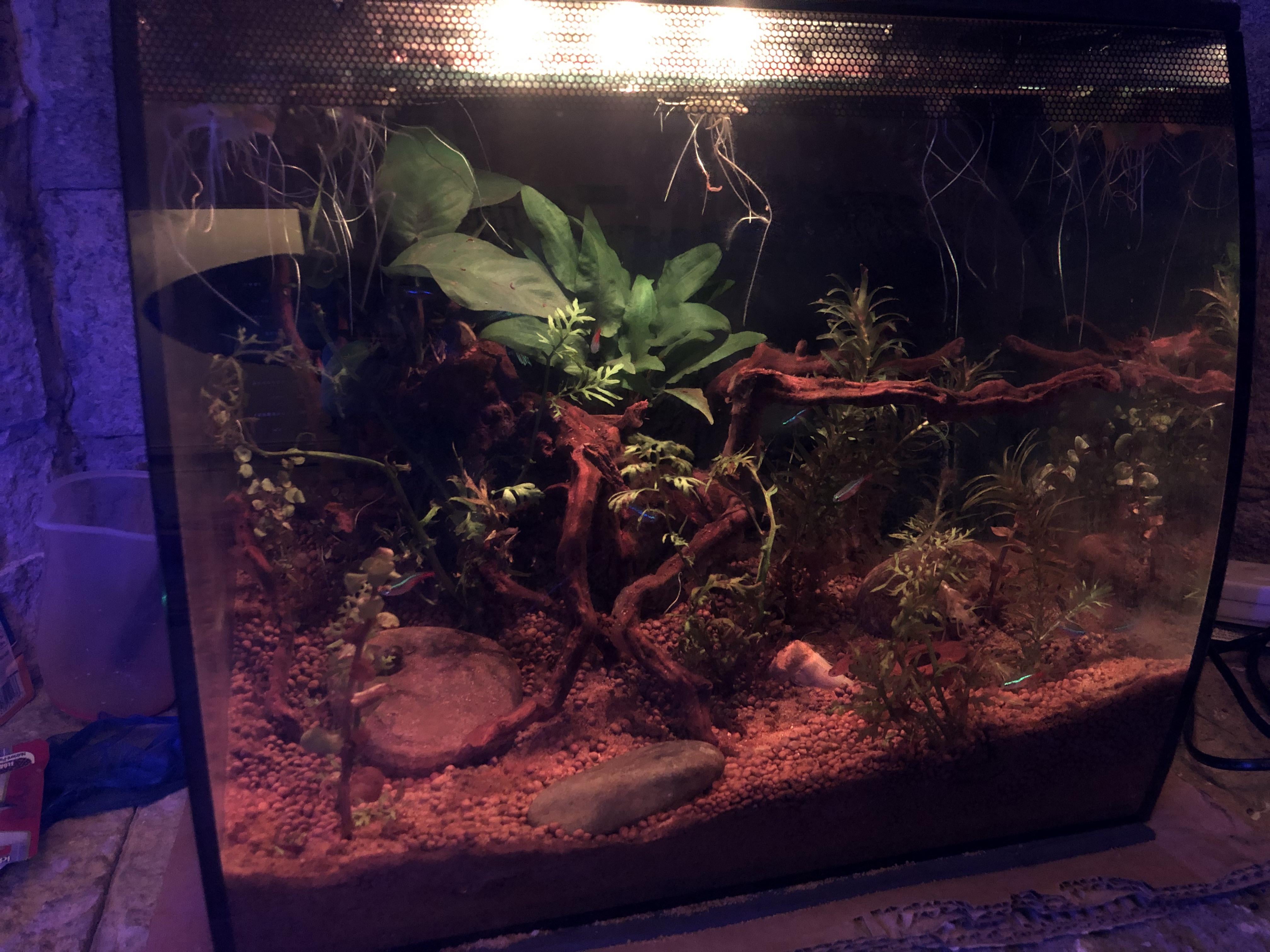 We have a 40 litre freshwater planted tank with some neon and ember tetras (collectively referred to as the fruit pastels) and a very handsome male betta fish named Rhubarb. We have also noticed over the last couple of weeks some small snails which we have come to learn are pests but they’re very cute and I’ve been removing eggs as and when I find them to try and prevent them from taking over the tank.