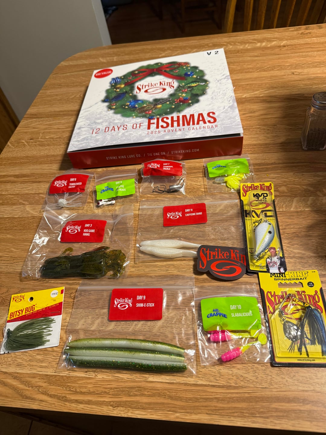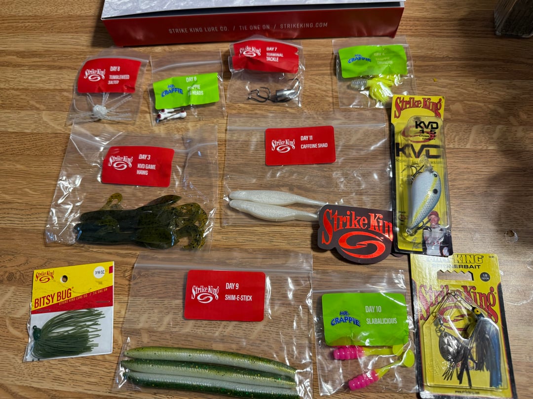 Strike king advent calendar on clearance at Walmart for $4.99 online . They have 2 different versions V1 and V2 .. same thing in both boxes just different colors for the items in each one .