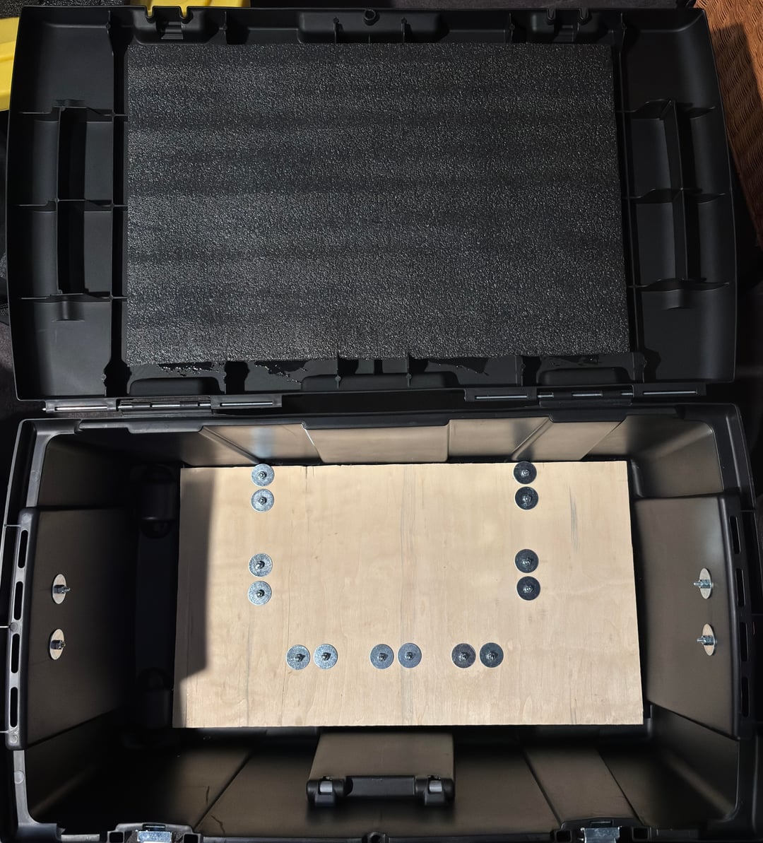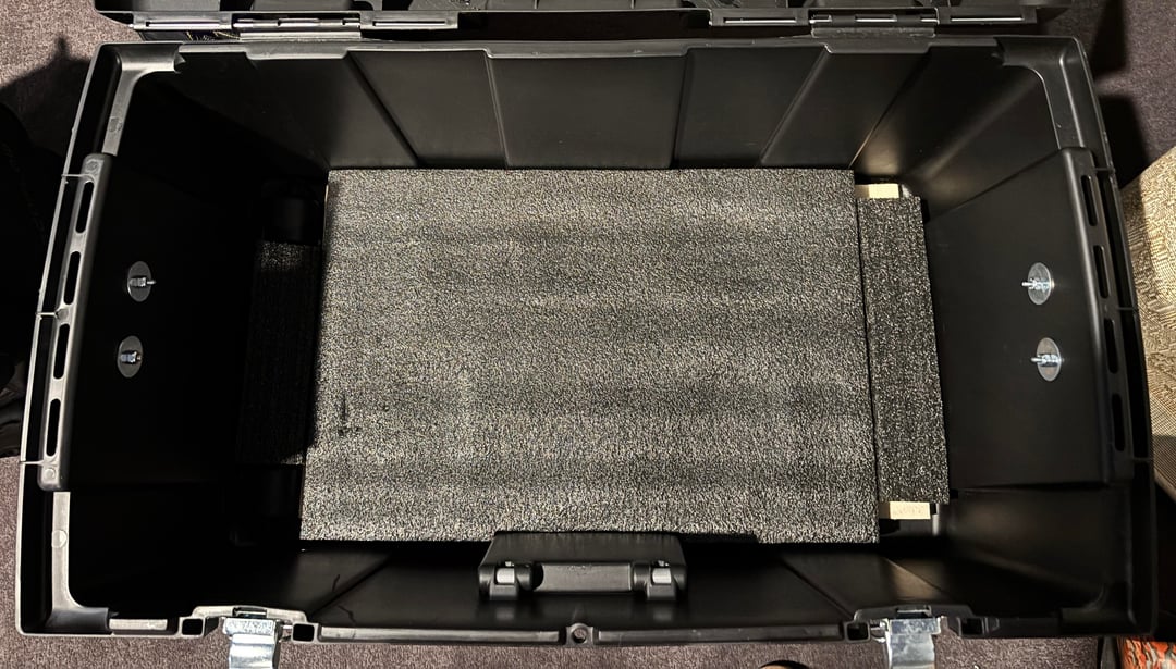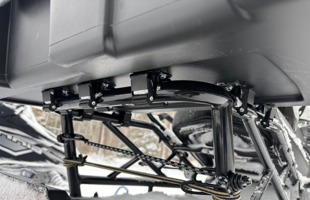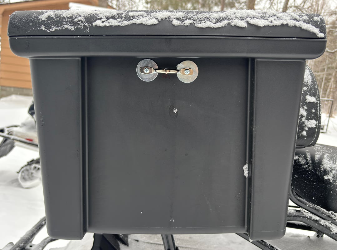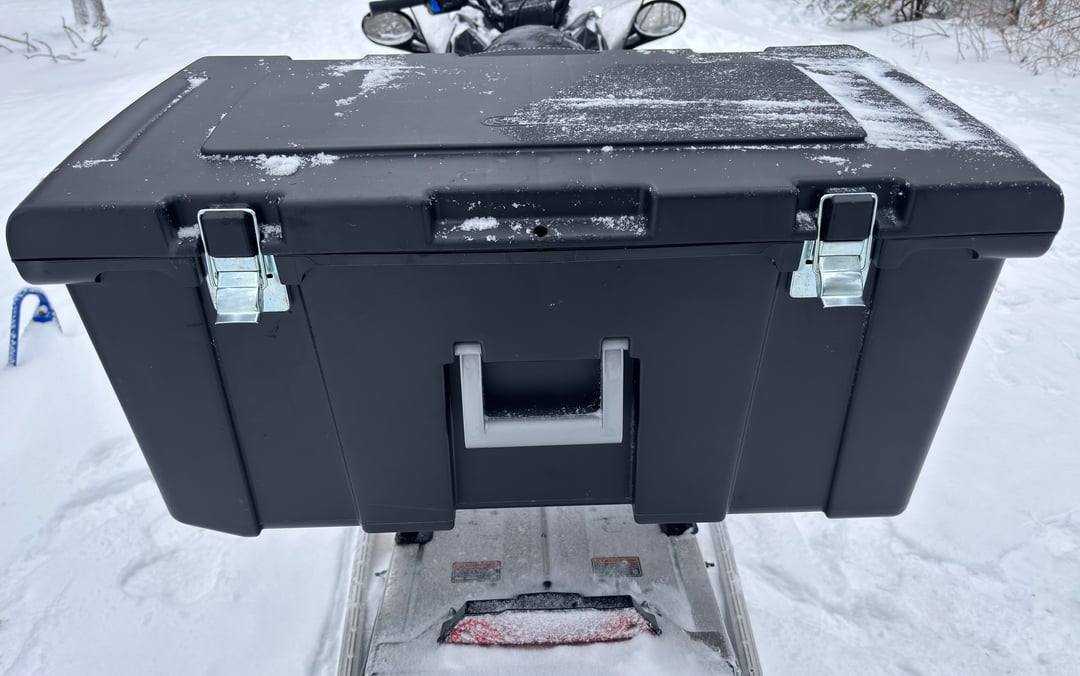 DIY snowmobile storage box using a plastic bin and broom storage clips. Tested it this weekend and it worked fantastic in keeping my fishing electronics safe and secure while driving on rough ice and snow.