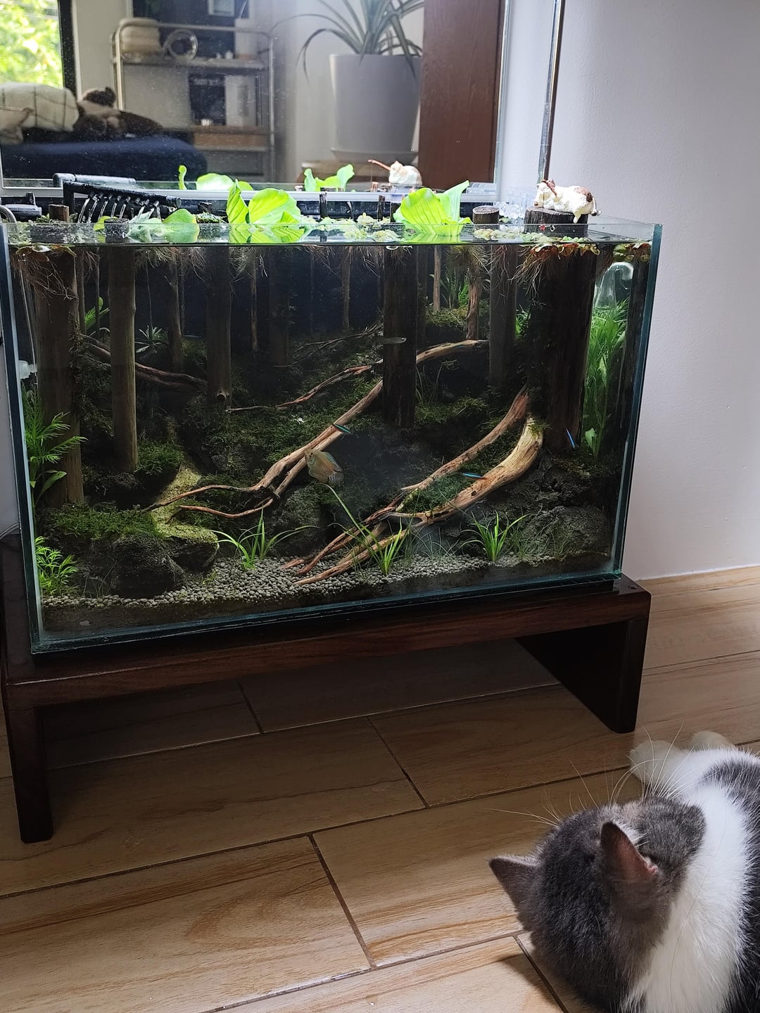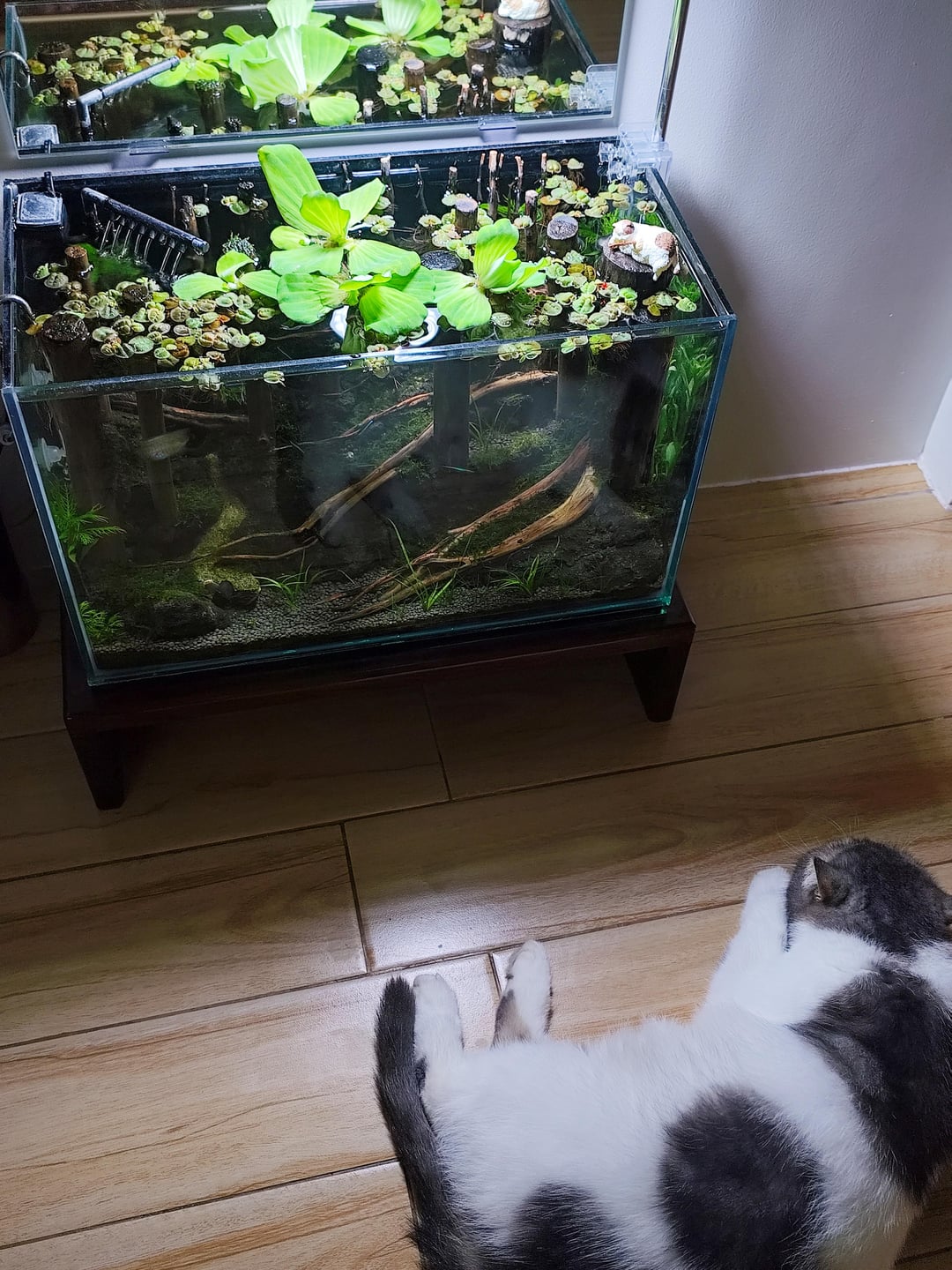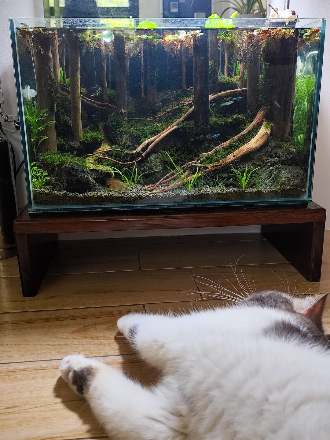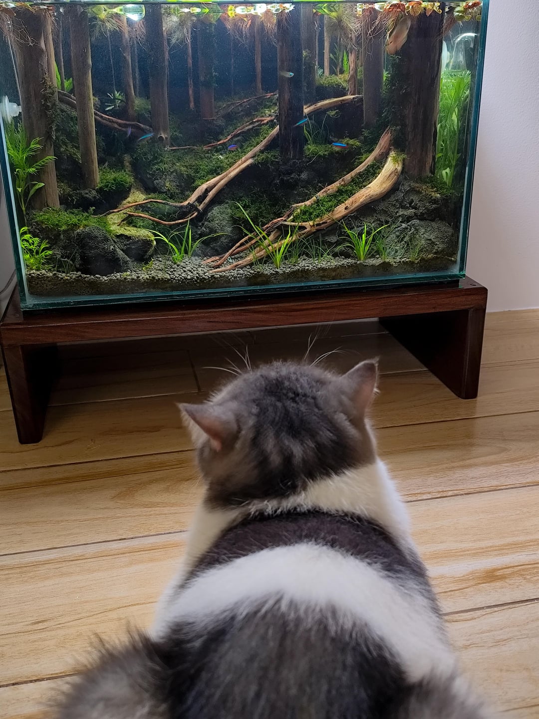 My cat recently just started paying attention to my tank and goes to my bedroom by himself every morning and would just either sleep in front of the tank or watch. He never once tried tapping the glass or tried eating the fishes (it's been a week that he's been doing this)