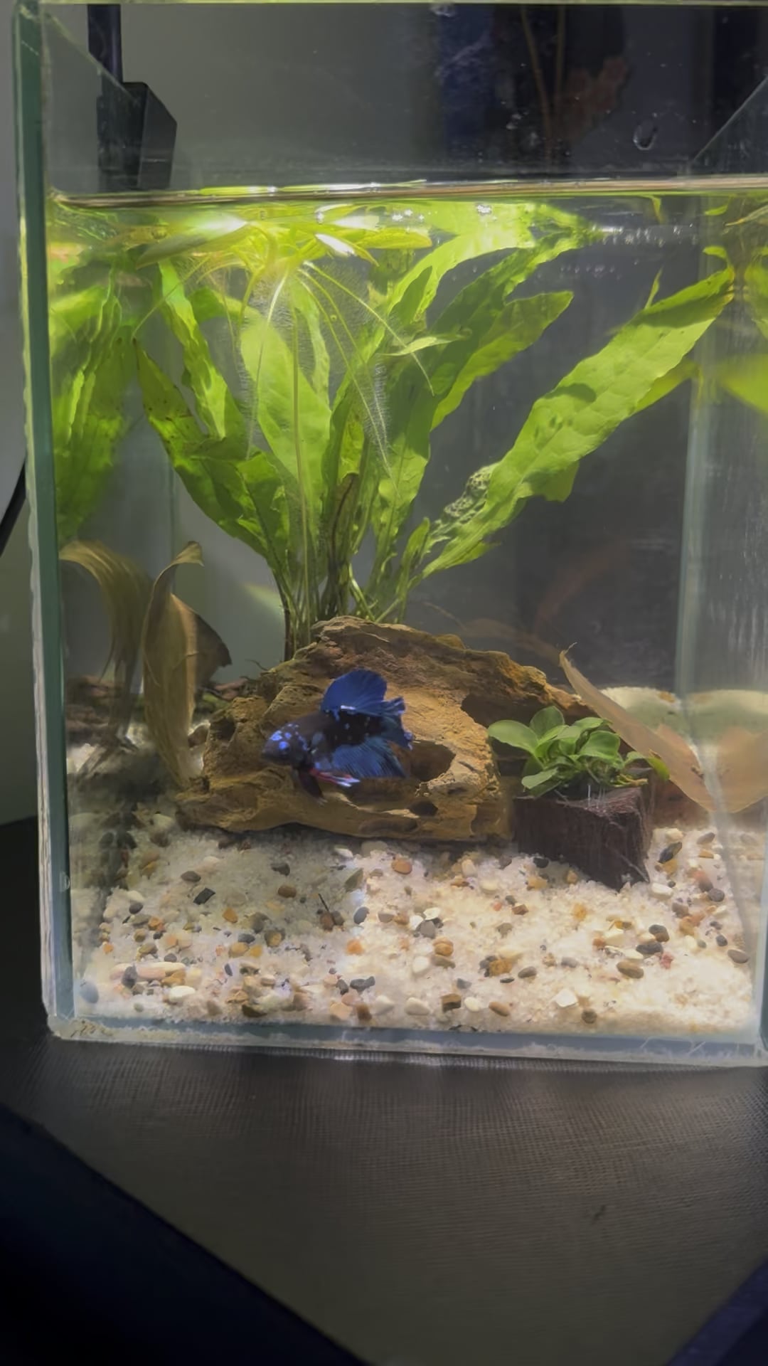 Meet Payakan! My first ever betta~ he’s an avatar x black galaxy with a marble gene. Born September 2025 in Thailand. I’ve been so obsessed with bettas since i was a kid and finally after getting my own place i can keep one. He’s super energetic and always greets me when im near his tank! Im quite new in building tanks as well and with the budget i had, this was the tank that i can give him for now. Will definitely upgrade little by little with a betta hammock as my immediate addition. Also, its a bit premature but i definitely want to breed him in the near future and hopefully get to keep some of his offspring. Are there any avatar keepers here? Would love to connect and also see yours as im in love with how beautiful they are!
