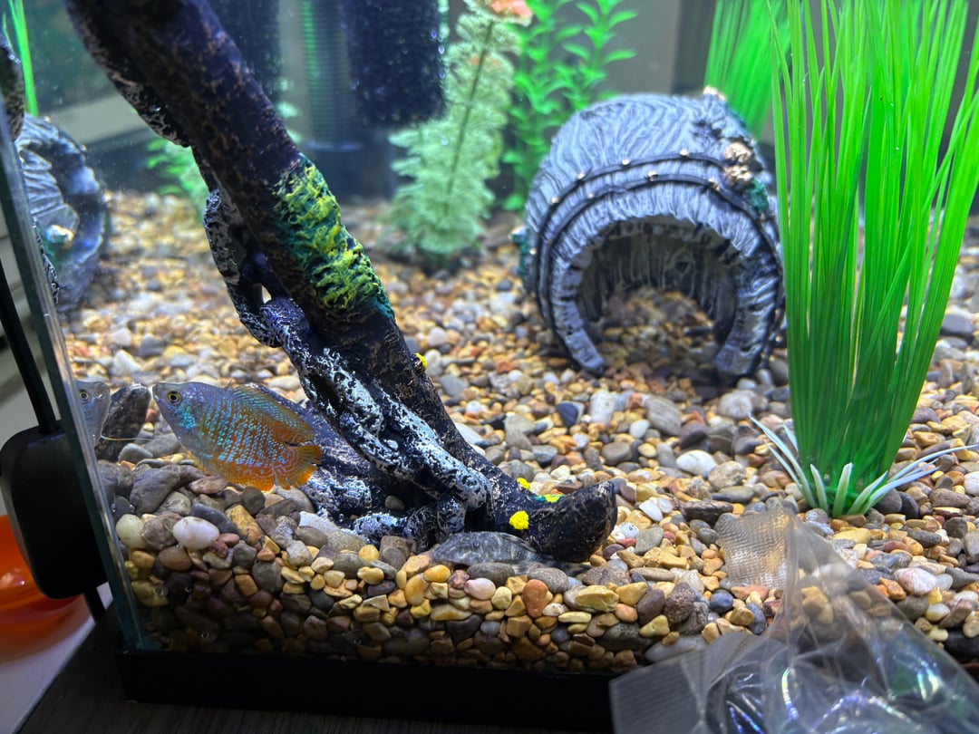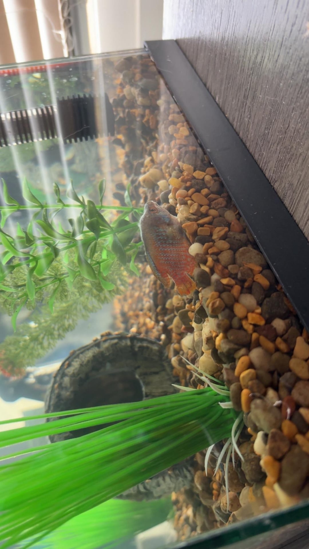 Hello I don’t know if this is the right subreddit. But I’m new to fish I have a 10 gallon tank with water fall filter and a heater setup. 2 days ago I randomly found the pleco unmoving pale and dead unfortunately I found him after I got off of work so he was in there for at least 7 hours I’m not sure how long he was dead for tho because he hides in that barrel. But I did not see him before I left to work. It is now 2 days later and my dwarf gourami now looks like this almost looks like he has a white film/fuz on him and just sitting at the bottom of the tank less colorful and was like hiding behind the heater yesterday. This is Petco fish so i understand probably not the healthiest but this is extremely sudden and I’m not sure what to do