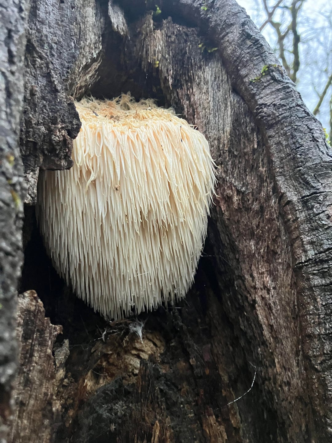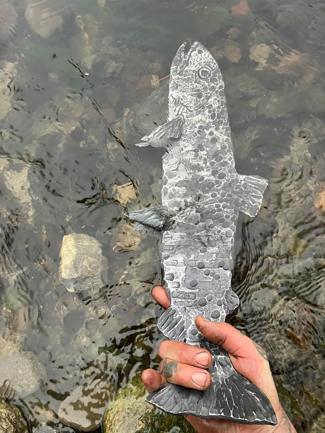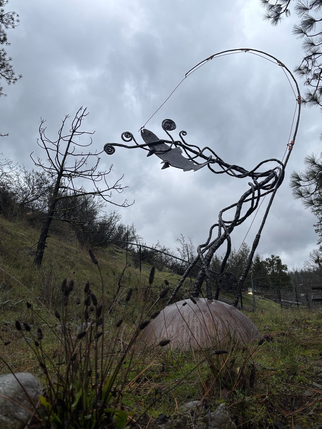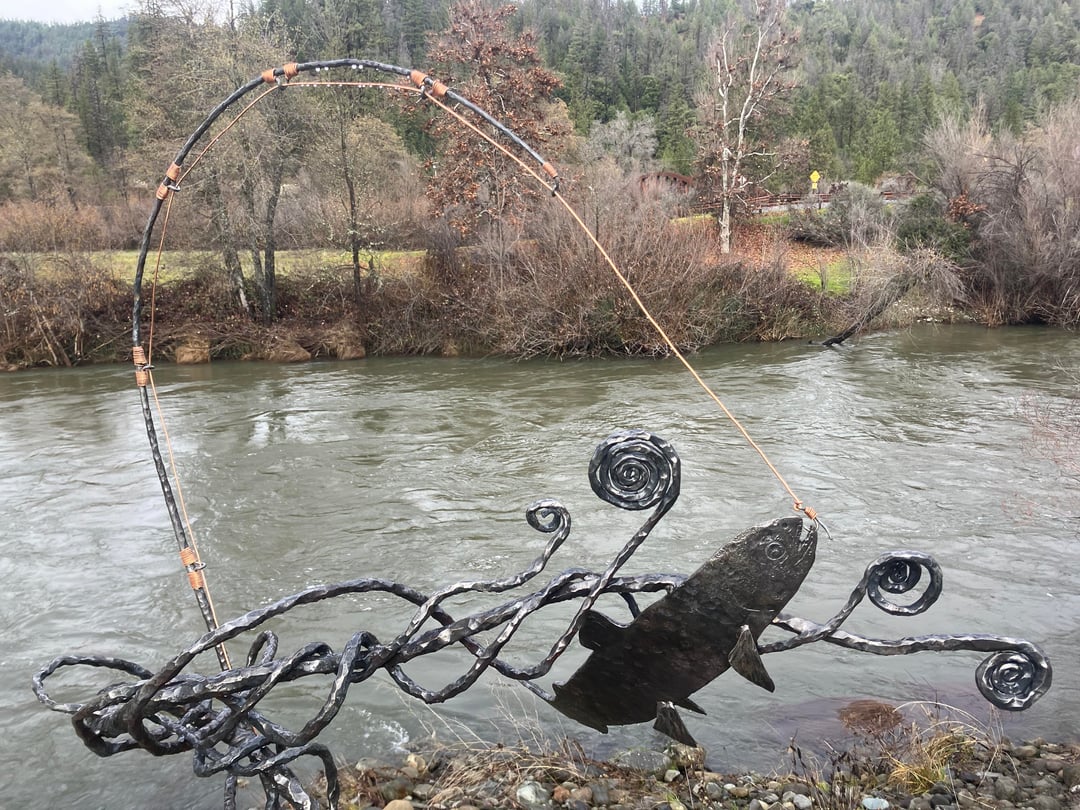 We finished another fly fishing themed sculpture/sign. We’re calling it “The Currents That Bind.” The sign portion was left off for photos. Some of you may see it if you’re floating the Trinity River in CA between Lewiston and Douglas City. The steelhead fishing has been great this fall, although the storms have clouded it up the last few days. As a bonus, we found a lions mane mushroom in an oak tree next to where it sits.