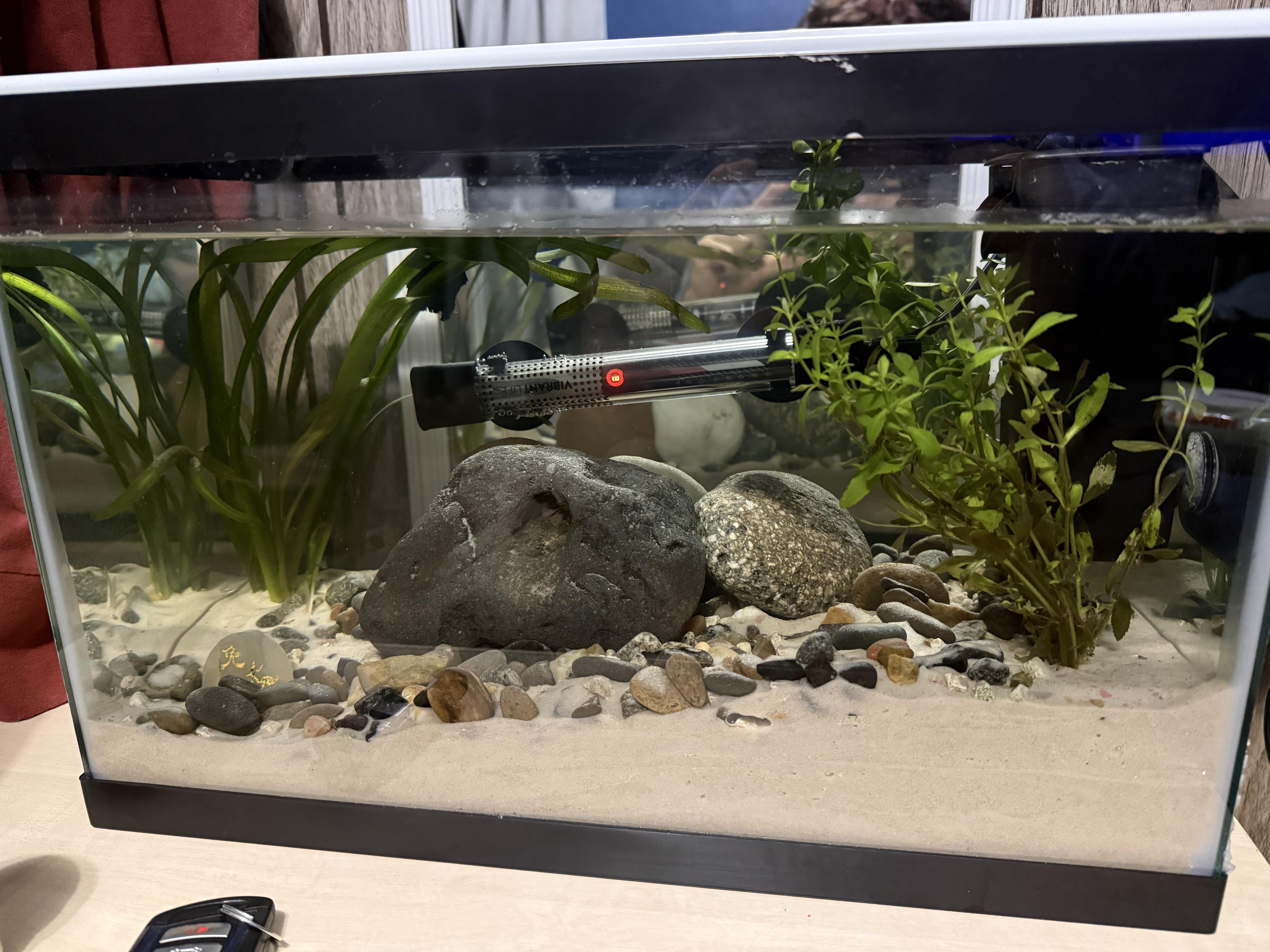 Hello everyone, I just got a betta fish on Saturday and this is his tank. I want some suggestions on what to put in it and I’m also wondering if this is sufficient for a betta, should I add more plants, should I get him a hiding spot. I’m also wondering if I should move the filter and heater to a better spot, currently when I have the filter on he gets pushed around a lot. Thanks for any suggestions