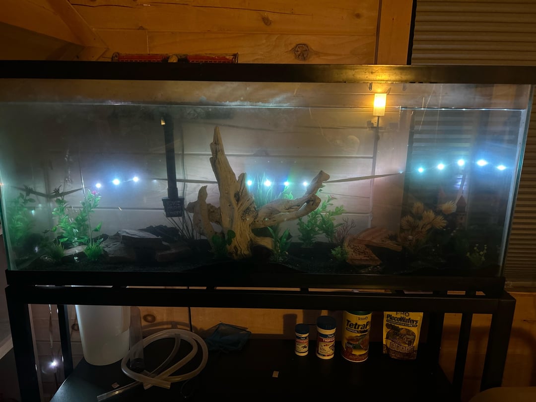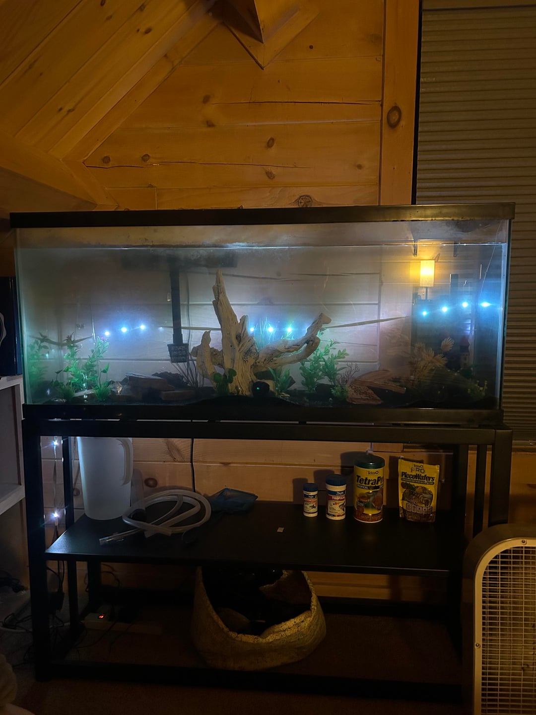 After a lot of Reddit posts I have bought a stand, remodeled the tank, bought the right fish for the tank. I also bought a large heater and new filter that are coming in tomorrow. The fish are very active, my pictus cats are always chilling on the bottom, eating everything and zooming, my rainbow sharks love there hiding holes. Each one chose their own space. My favorite of all, the angel pair I got are swimming and always wanna eat. They come to the feeding spot every time I get close to the tank. Is there any suggestion on other things to make them happier. I am new to this and wanna give them the best life possible!