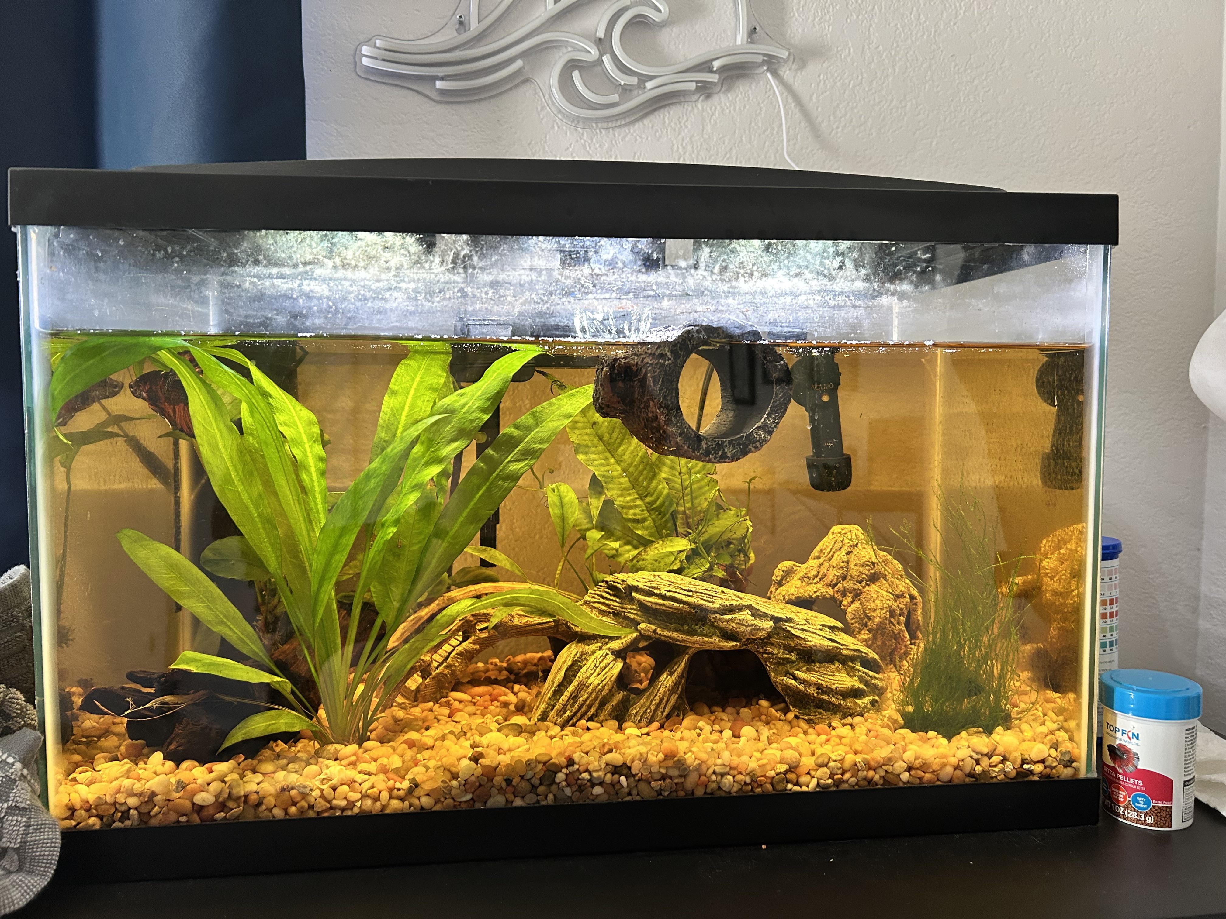 I’m working on getting more plants (any suggestions would be helpful) but this is my 10 gal for my king betta (plus snails)