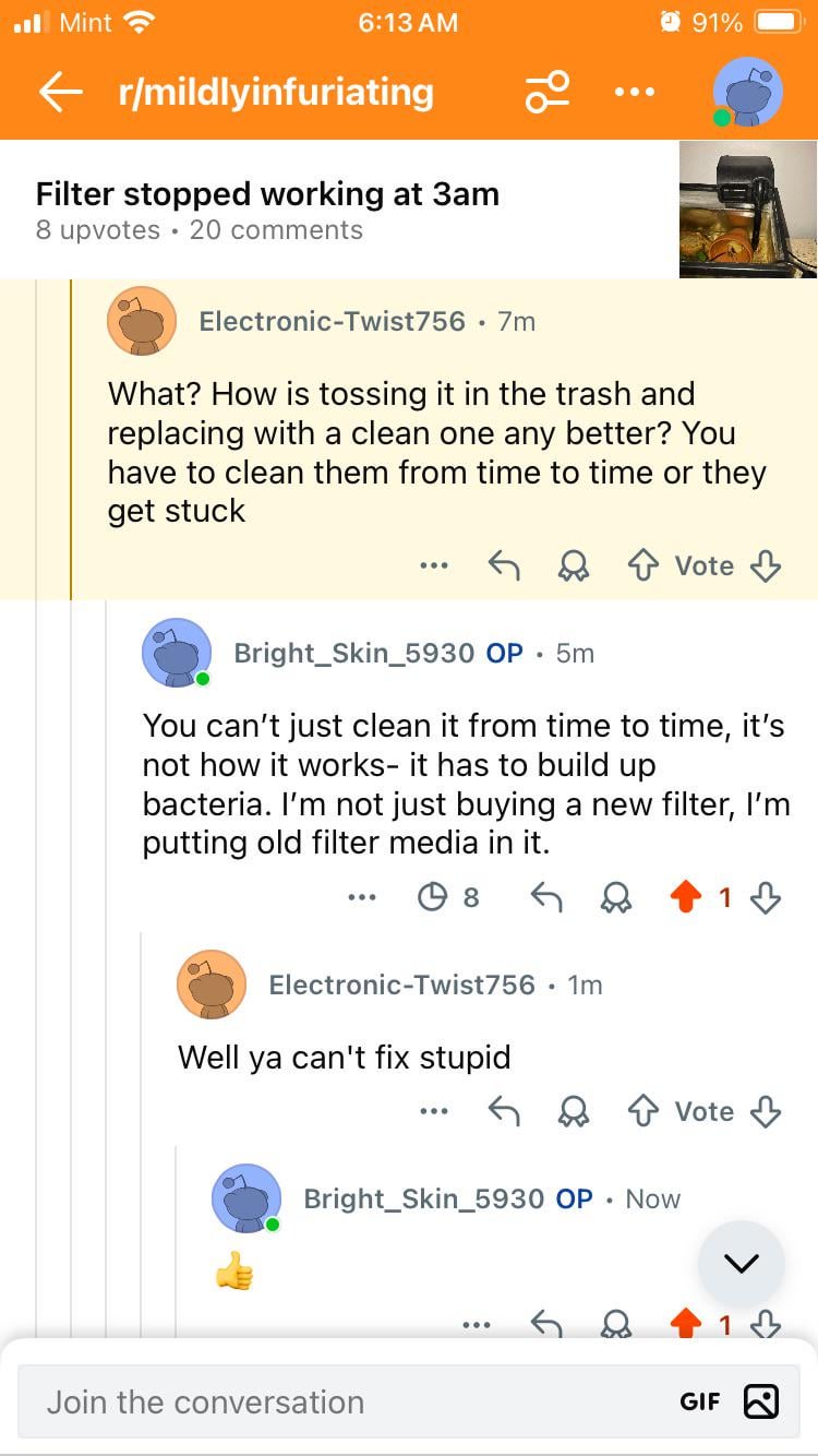 1. Think you’re just misunderstanding each other here. They’re asking why not try to fix your filter by cleaning the internals instead of just getting a new filter. And you’re thinking they’re telling you completely clean out the media I guess.