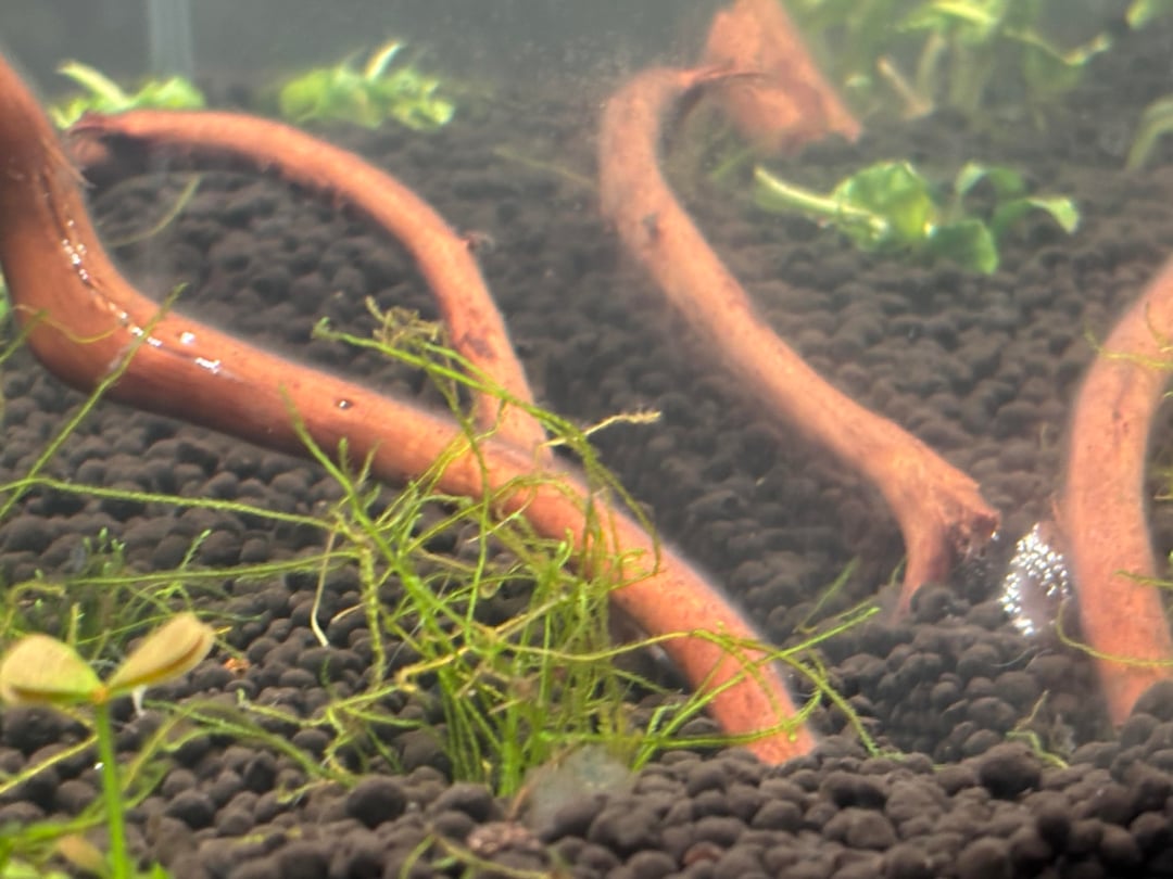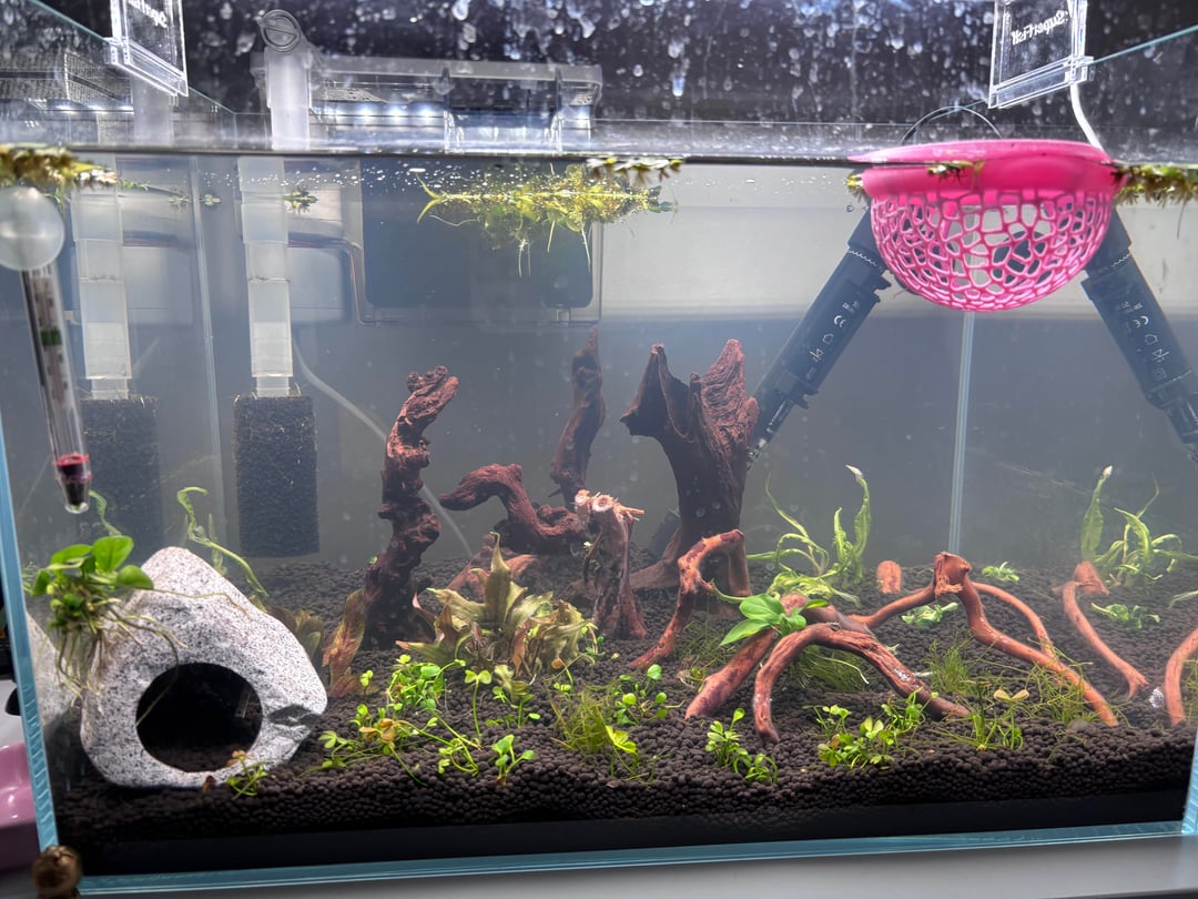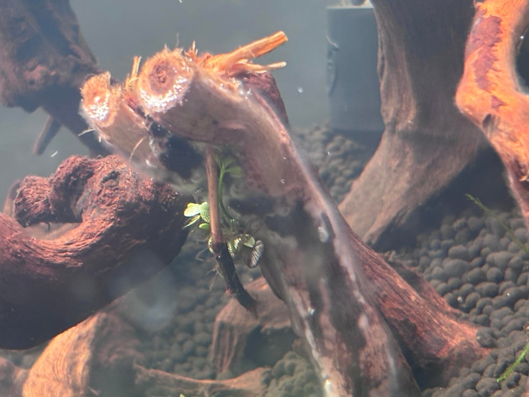 I need to check parameters when im home but theres weird gross stuff on the wood which i think is good but my heater isnt heating very well.. it seems to be stuck at 23c but i got rid of the flashing light so i think it will heat properly now.. my water still seems to be like white and kinda gross ?? I need some bigger plants too but :3 the wood is NOT structurally sound at all and i am scared for the water change as it WILLLL get dislodged but all i can do is hope