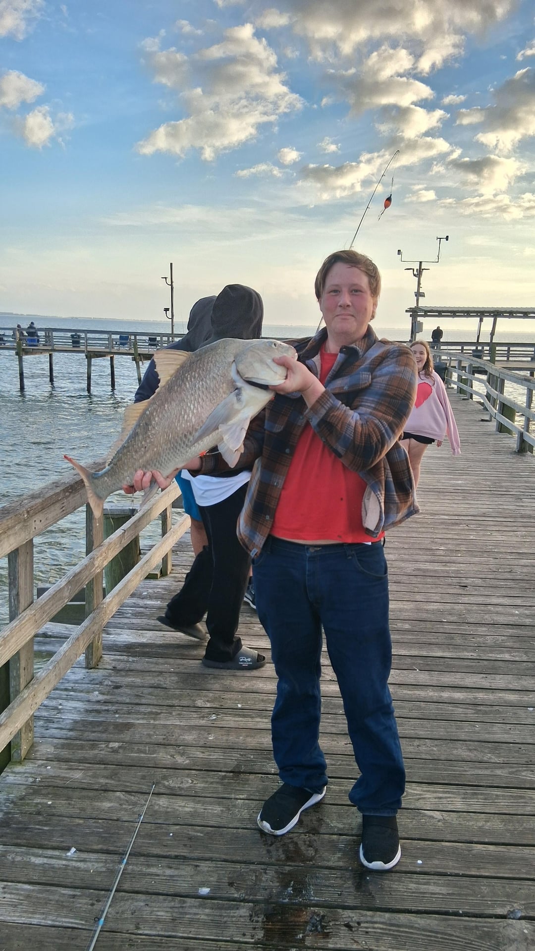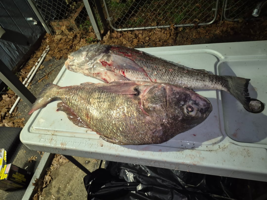 Monsters i caught these fish on the 40 dollar fishing florida rod and reel combo from Walmart thst came with a decent amount of tackle in a clear case. I was using dead shrimp on the bottom with 1 Oz pyramid weight and a double hook bottom rig not sure what its called. But the reel size is a 5000 reel and needed a new rod and reel cause my 10 year old rod and reel finally wore out. The biggest ine was 56lbs on the scale I didn't keep him I only kept two out of the 10 I caught In a 5 hour period. The ones on table one weighed 32lbs and other was 41lbs on my scale. My first time ever keeping bull black drum like this and will never do it again. Nasty to clean slimy and worms. I know you can cook them out but there was also other parasites in the meat that looked lile little beetle things and the meat had a strong dingy smell. These fish fought and dug deep and when they saw pier they started raking lots of drag again. My phone died after I caught the first one with i had pics with the 56lber. It was the biggest fish of my life I caught yesterday 56lbs. Fought it for a good 20 minutes on the pier cause he took for ever to get worn out it was a blast and now I see why people enjoy targeting these bull black drum like this especially on a medium size rid and 5000 reel was perfect not to big where yoy dont get a fight but not to small where they break the reel.