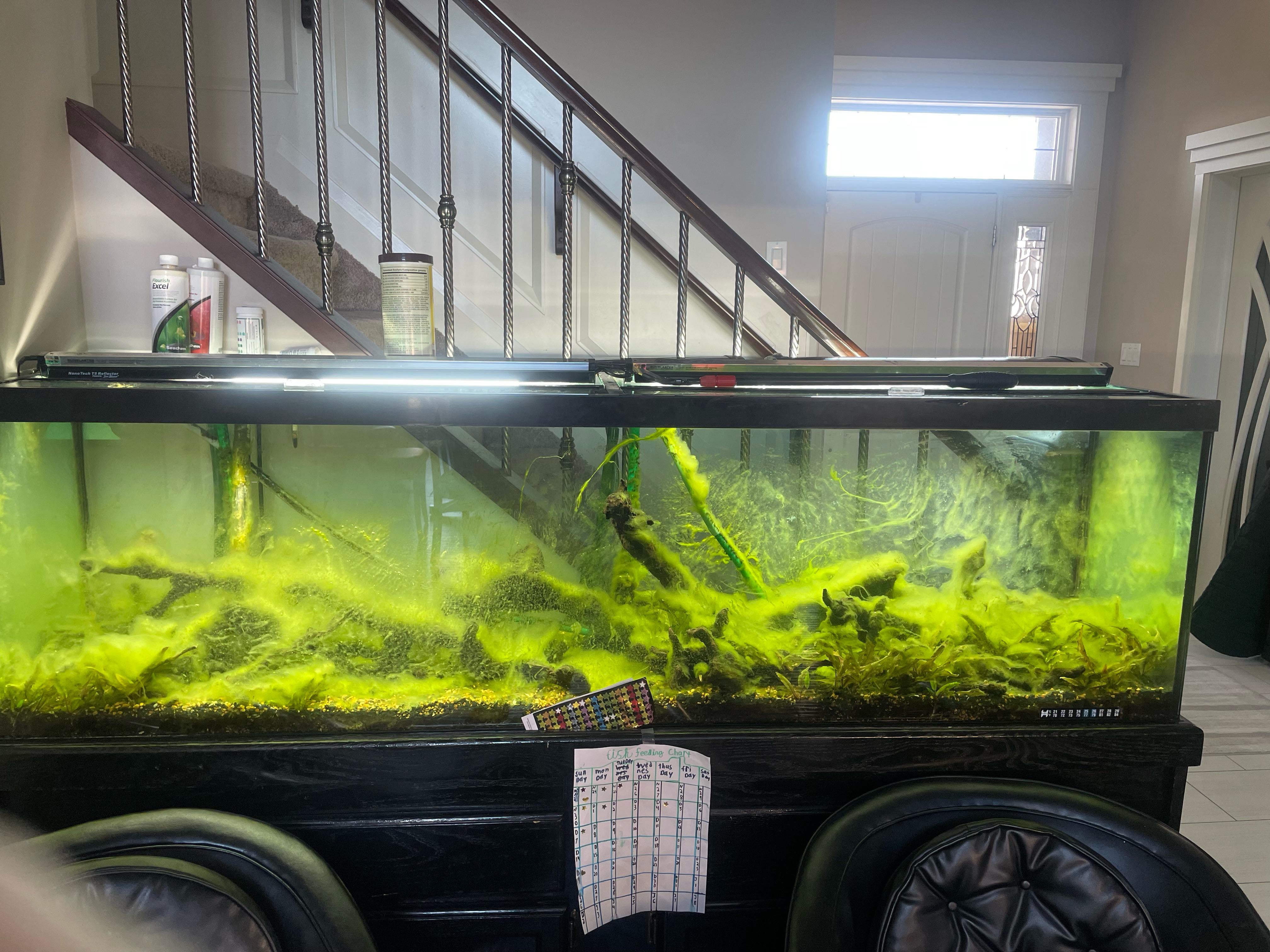 After you get it all under control, put dimmers on those lights and drop it to half the light intensity. Add some good plants, some snails, and some cheap fish or do a fishless cycle with ammonia. Once you’re cycled, restock the tank and stay on top of those water changes.