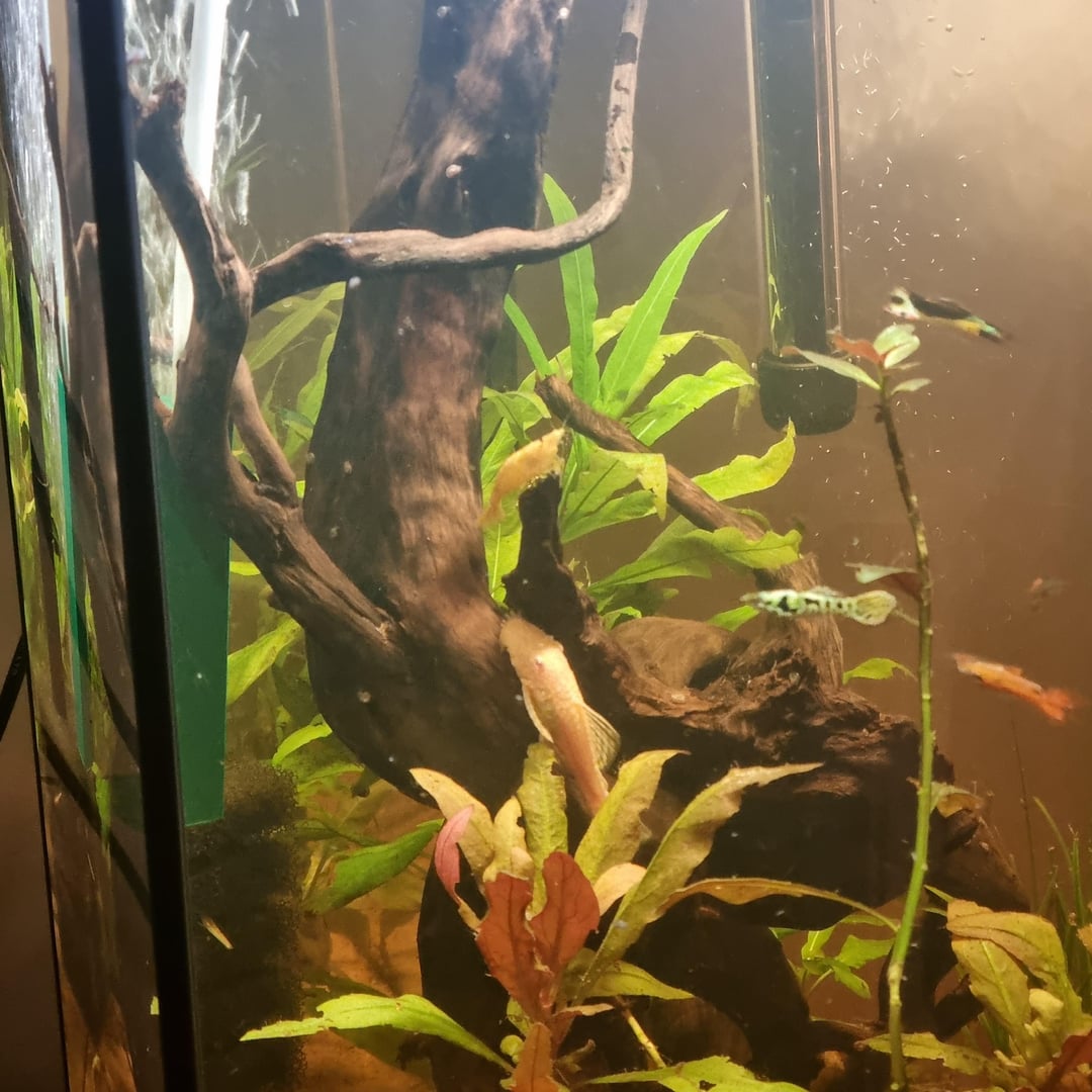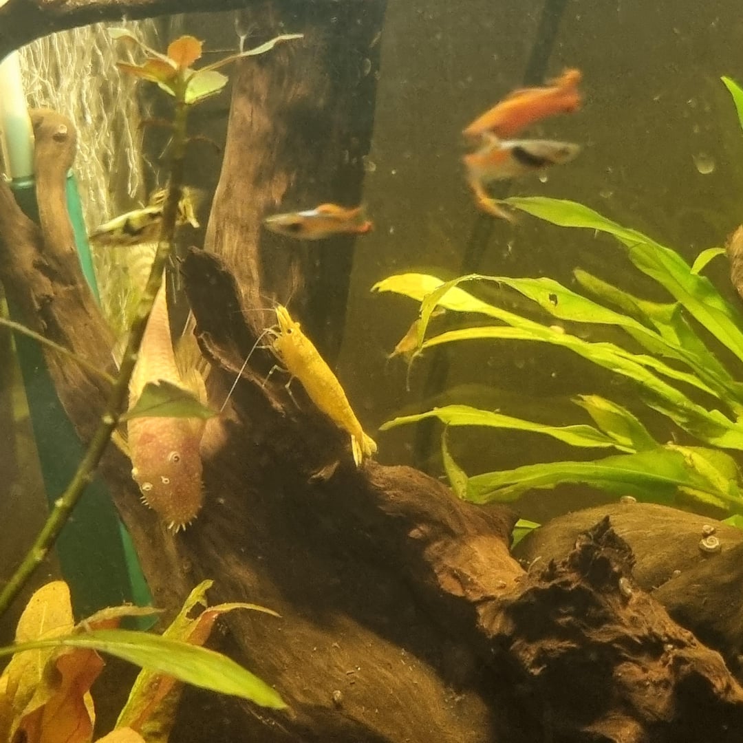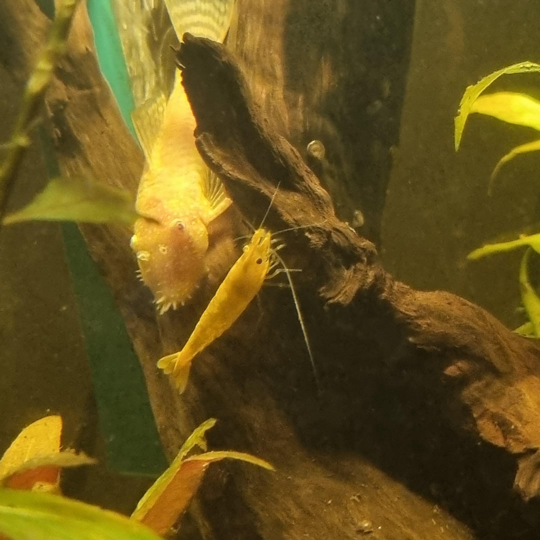 This is Sanpellegrino, one of the first cherry shrimp I got and hes HUGE. He just kept growing, I'd guess he's around 2 inches long. The other (40+ now) shrimp in the tank are so much smaller. Why is he SO big? He's bigger than the guppies!