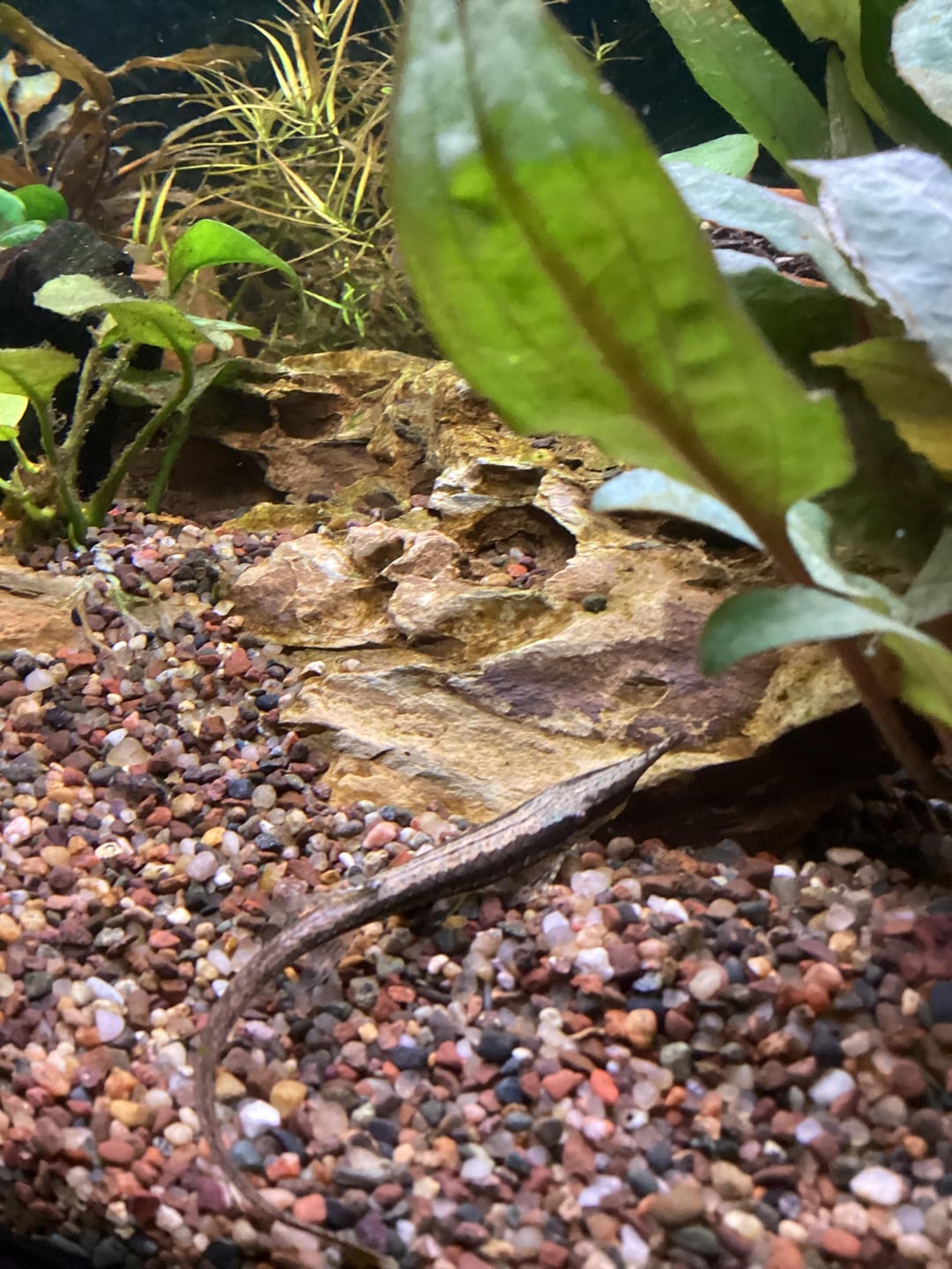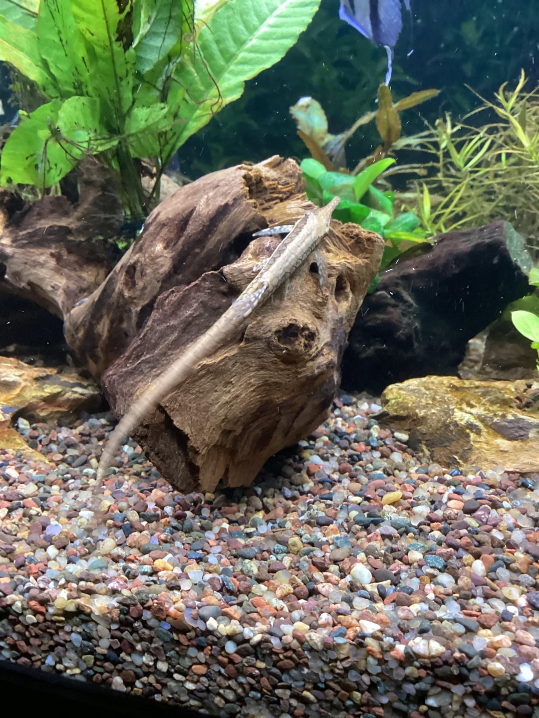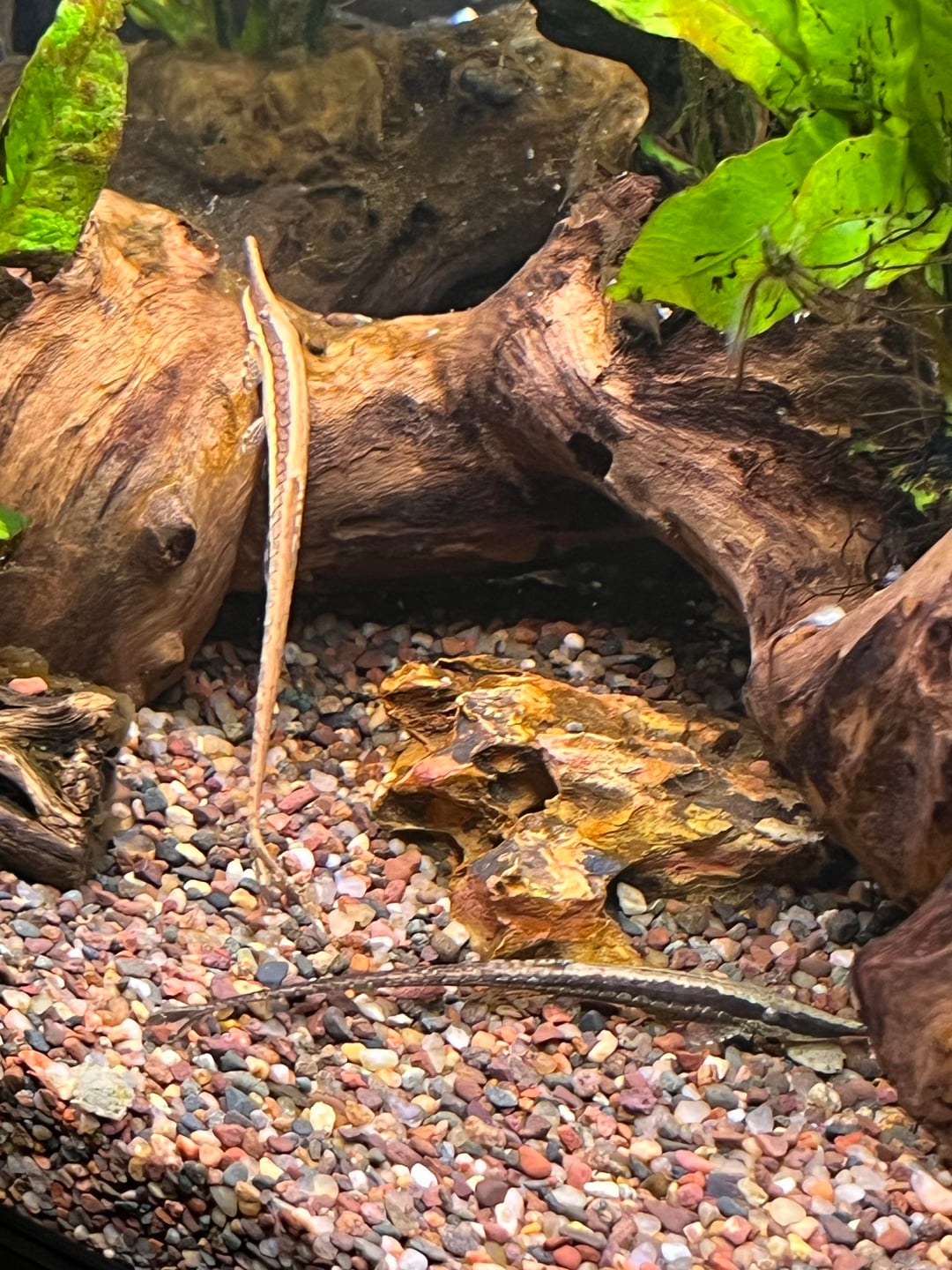 The Whiptail/Twig Catfish (Farlowella acus) is an oddball catfish that you don’t often see in your lfs. It is a peaceful algae-eating species known for its long, slender stick like body that provides camouflage in its natural habitat in the Amazon and Orinoco river basin in South America. It requires a planted aquarium with driftwood,rocks and high water aeration/water movement to mimic its natural habitat where it blends in with its surroundings. It often is not noticed until it moves to a new leaf, glass or driftwood in your tank. They are primarily herbivorous eating algae and biofilm along with sinking wafers, blanched zucchini,cucumbers and occasionally brine shrimp avoiding heavy meaty food, as this can harm them. They are peaceful for a community tank but sometimes squabble with each other without harm. They can be sensitive to poor water quality and chemicals. Males develop bristles on the snout when mature. They have a face only a mother could love with their long pointed Pinocchio snout, but this adds to the interest of this unusual catfish. Best kept in a 40 gallon tank with non aggressive fish as they are somewhat shy.