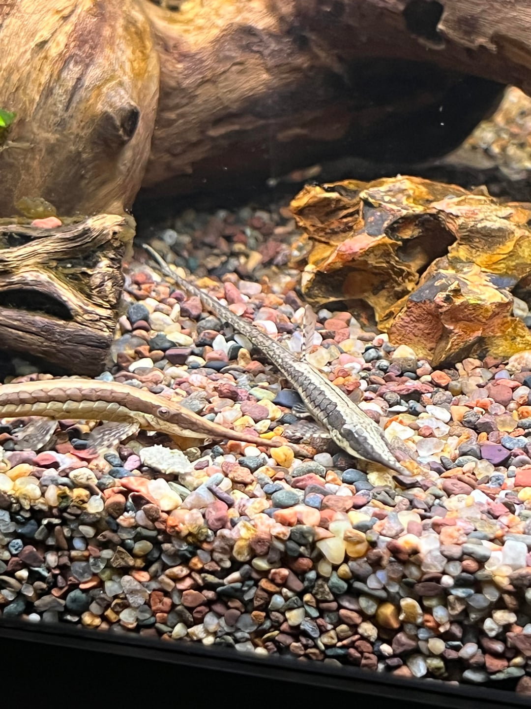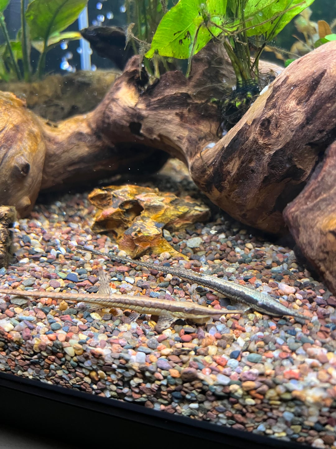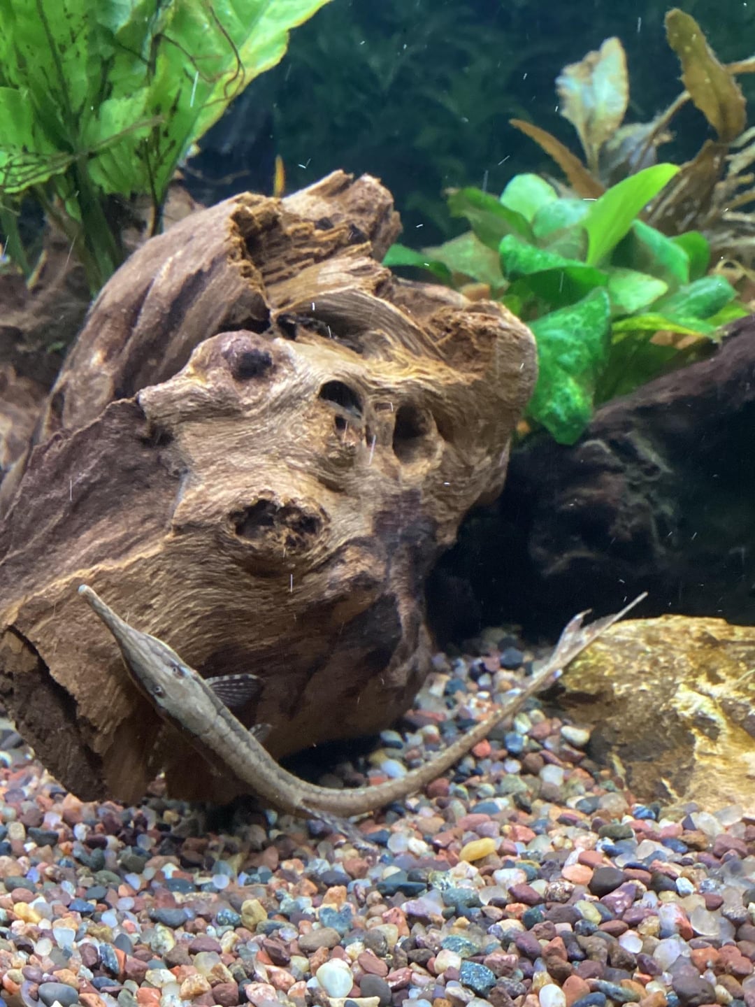 The Whiptail/Twig Catfish (Farlowella acus) is an oddball catfish that you don’t often see in your lfs. It is a peaceful algae-eating species known for its long, slender stick like body that provides camouflage in its natural habitat in the Amazon and Orinoco river basin in South America. It requires a planted aquarium with driftwood,rocks and high water aeration/water movement to mimic its natural habitat where it blends in with its surroundings. It often is not noticed until it moves to a new leaf, glass or driftwood in your tank. They are primarily herbivorous eating algae and biofilm along with sinking wafers, blanched zucchini,cucumbers and occasionally brine shrimp avoiding heavy meaty food, as this can harm them. They are peaceful for a community tank but sometimes squabble with each other without harm. They can be sensitive to poor water quality and chemicals. Males develop bristles on the snout when mature. They have a face only a mother could love with their long pointed Pinocchio snout, but this adds to the interest of this unusual catfish. Best kept in a 40 gallon tank with non aggressive fish as they are somewhat shy.