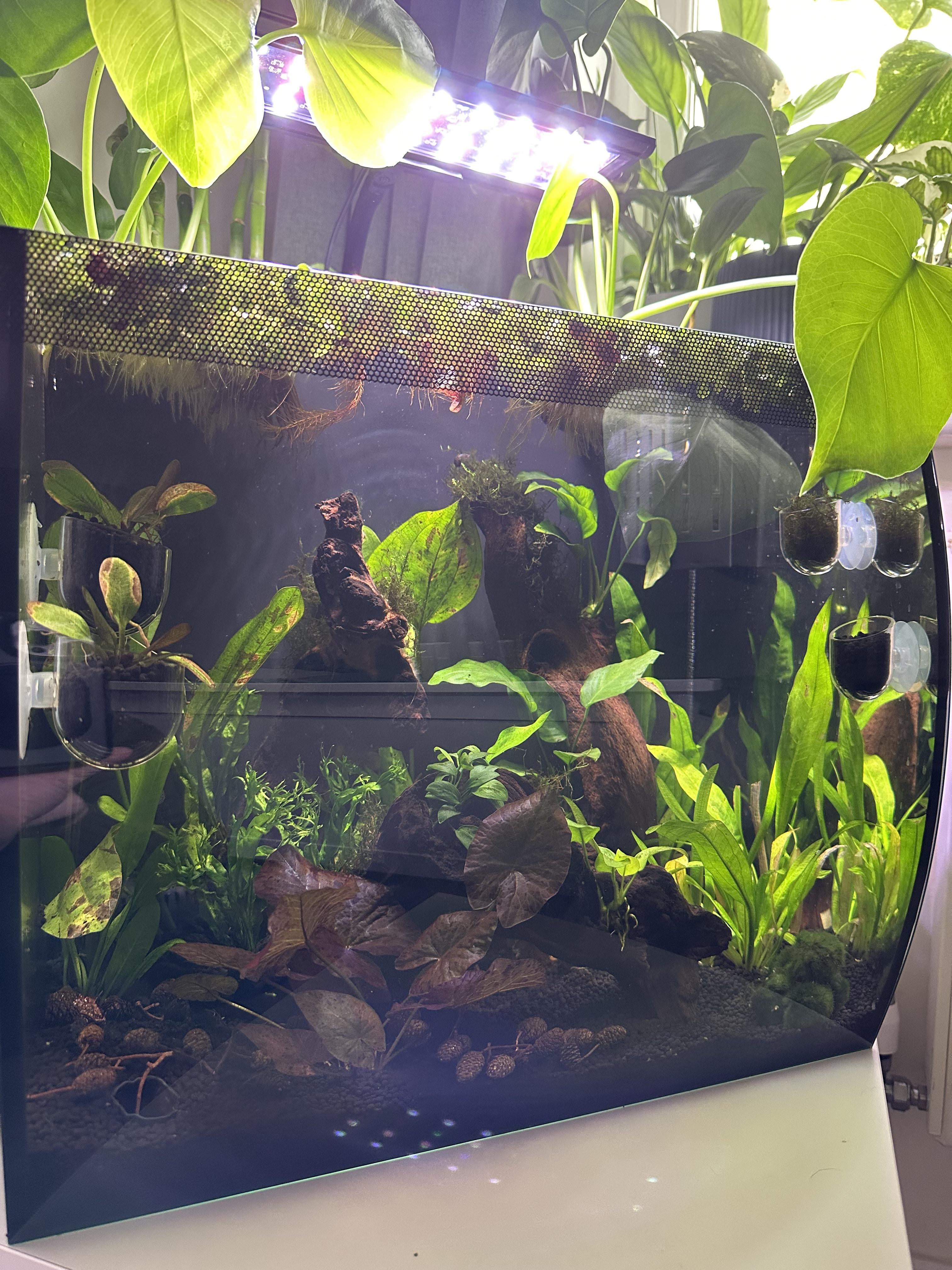 I also have a small number of detritus worms, copepods and bladder snails that must have snuck in on the plants but they seem to be doing well… so I’m hoping that’s a good sign. I’ve also had biofilm on the hardscape and on the surface (although the snails are now doing an excellent job of cleaning that up) and the red tiger lotus as well as the floating plants have grown massively… is it time to add shrimp and fish?