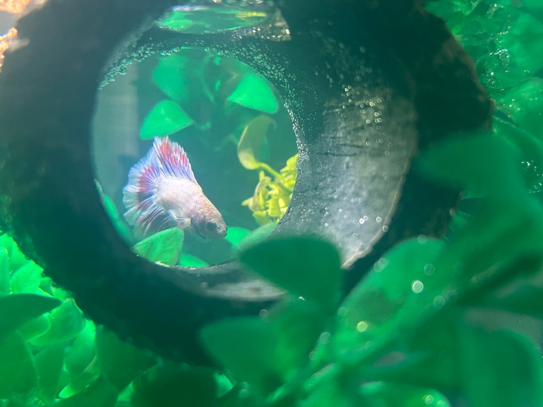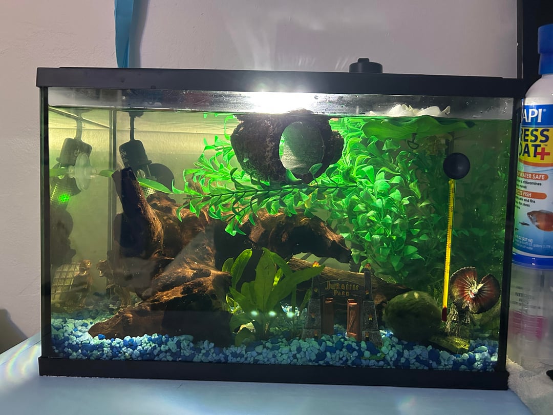 hi guys!! i got my boy henry a few days ago and recently added driftwood and i ordered a few more live plants to replace the large fake one i currently have in the tank. it just looks very crowded to me, with the plants, ornaments, drift wood, floating log, betta leaf, and lotus. He has a filter and heater in there too