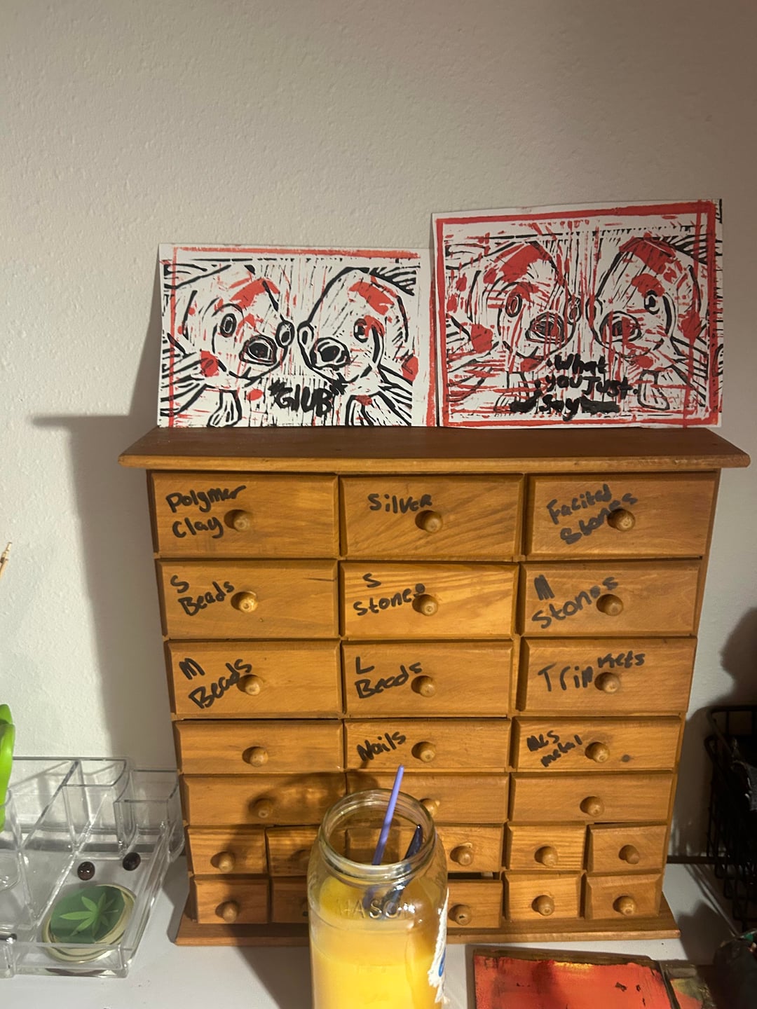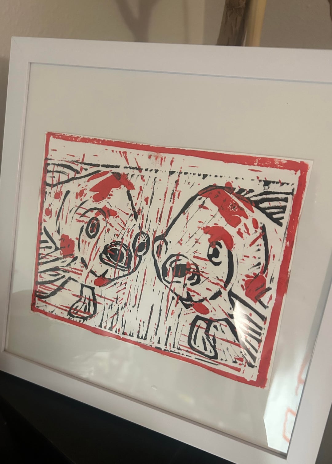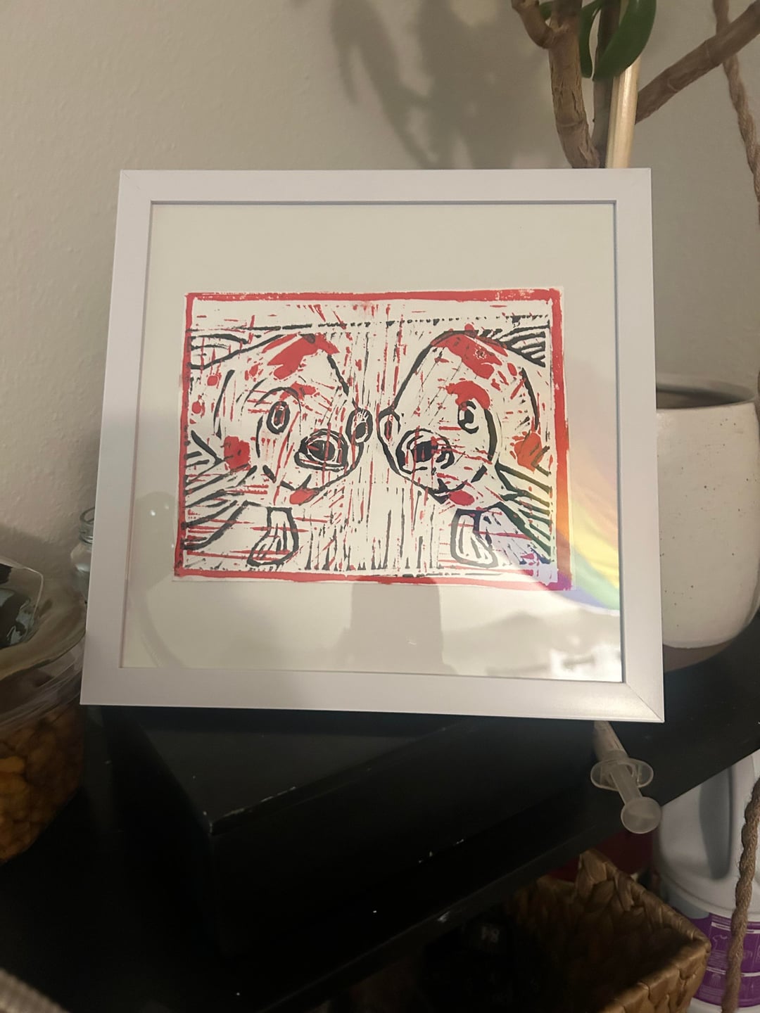 This was my first large linocut/printmaking project and I knew I had to incorporate my hobby’s together. It is an apex. 3 inch by 2 inch hand drawn over an image, Lino cut printing of two fish that I really thought where cute.