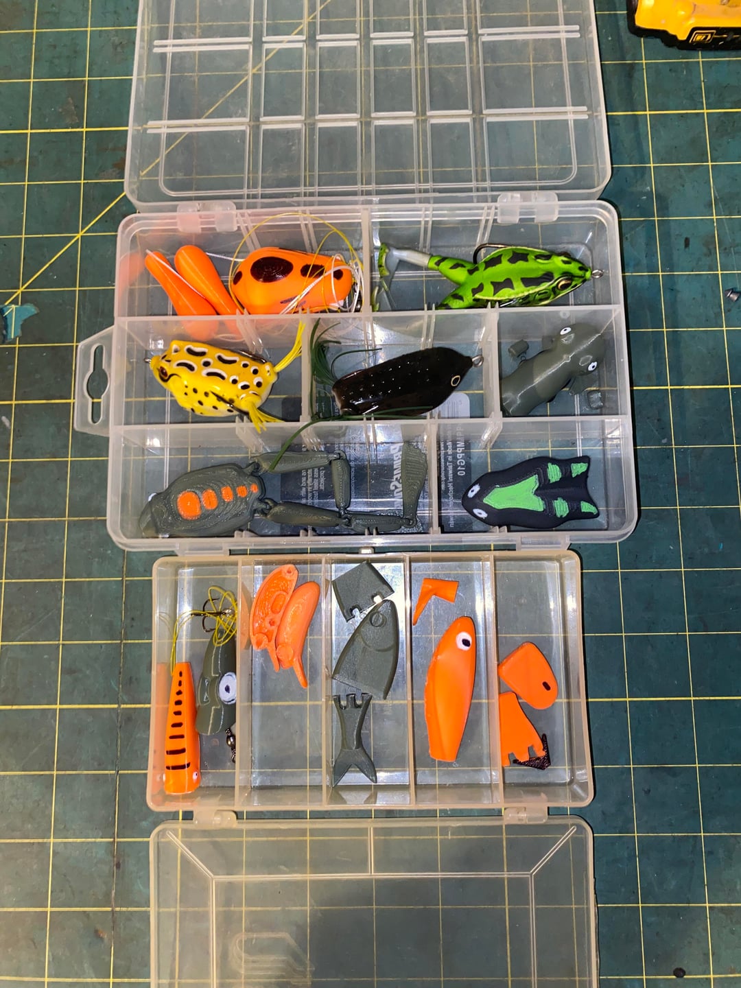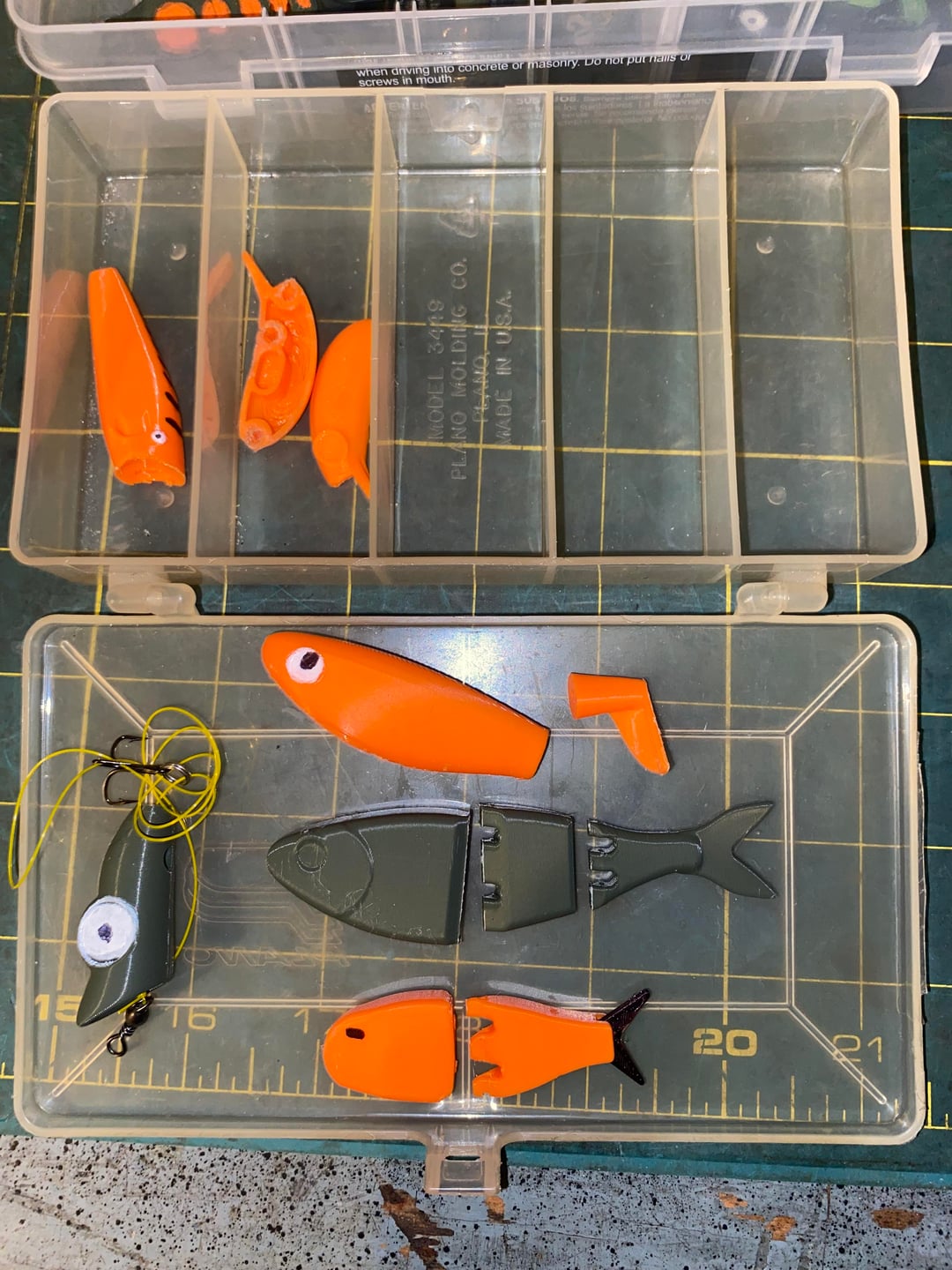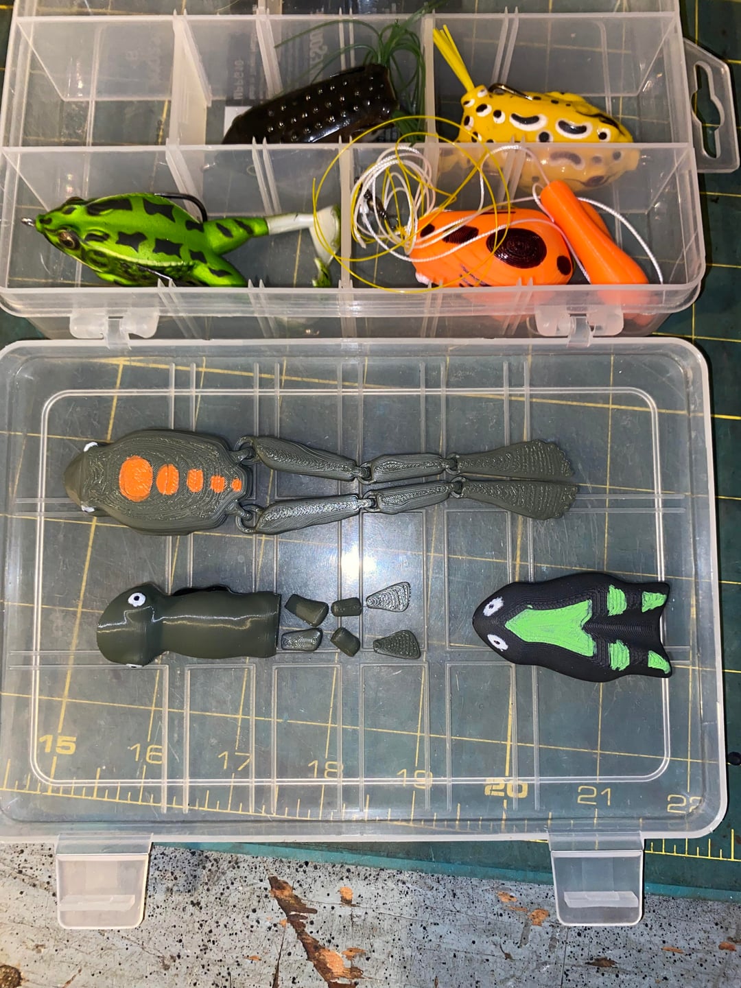 still need to finish installing the hardware but wanted to show some of my 3d printed Topwater Poppers, Frogs and Swim/Glide baits. going to ty some squishy TPU one down the road. Posted by Inspect0r__Gadget