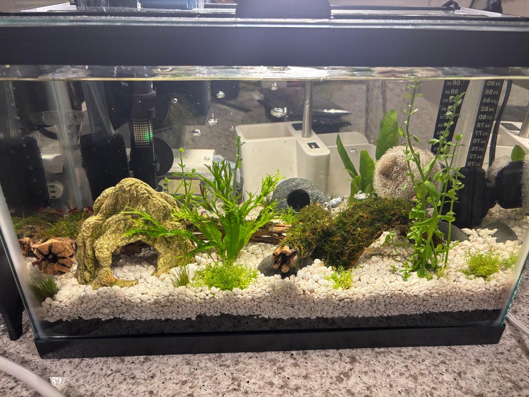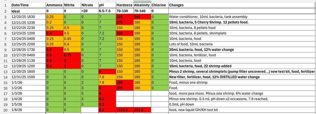 So I recently posted asking about why my shrimp are dying. Sounds like I definitely added shrimp too early, the hardness of my water may be an issue, and my substrate may be contributing to hardness. I was told the high pH is unlikely to be an issue? As recommended, I got a liquid GH/KH test kit. Results are GH is >214.8 (14 drops to color change), and KH is 214.8. Any recommendations going forward as to distilled water, water changes, and potentially removing white substrate?