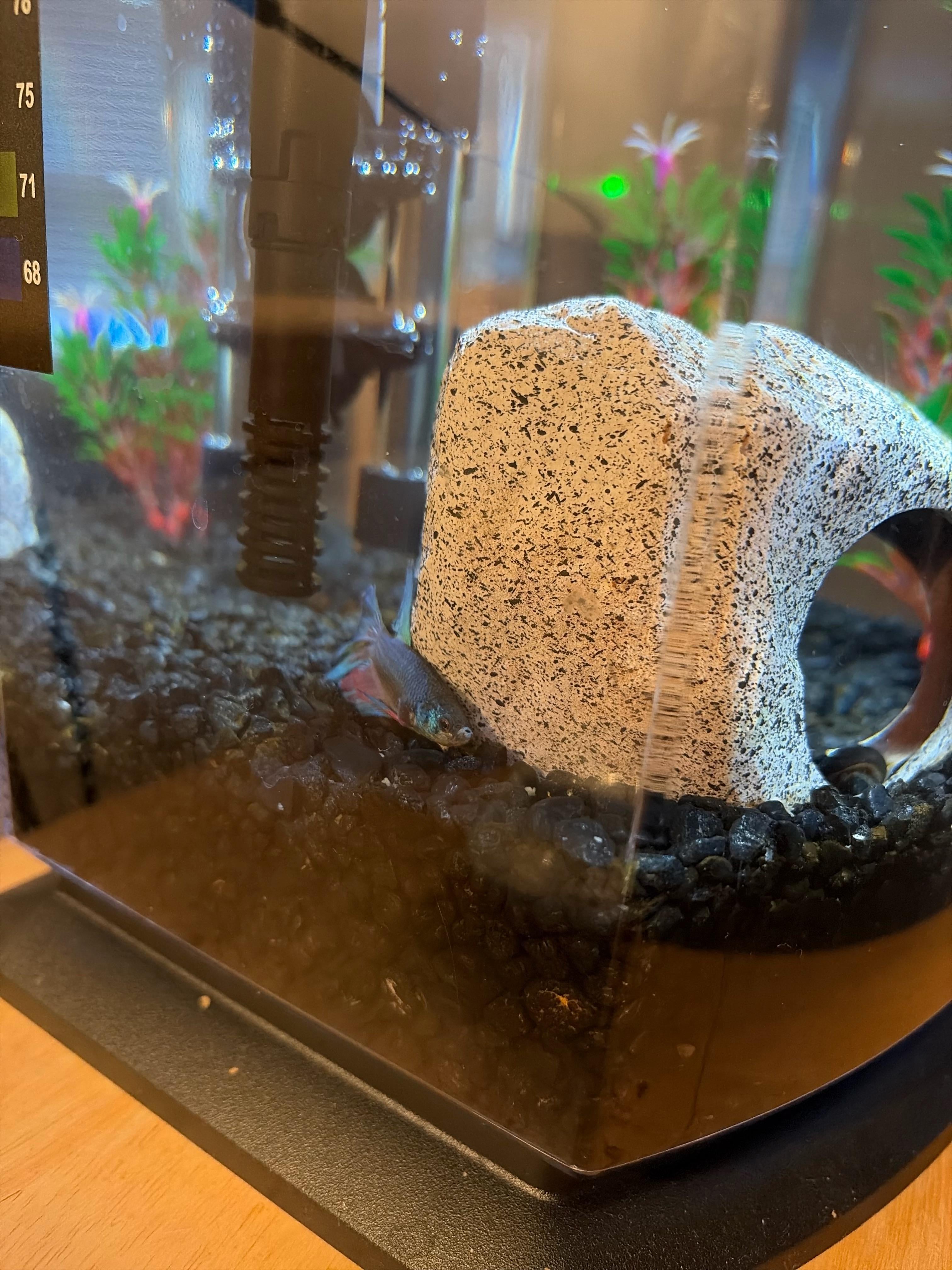 My fish, Fionn, seems to have something wrong with him. A couple days ago we noticed his water was very cold (because our house is) and decided to get him a better heater. The new one we bought works great and we’re slowly increasing the temperature each day, but he seems to be very lethargic. He’s usually very active and swimming around but now he’s just been laying in his rock or on the ground for over a day now. I had go basically shake the bowl to get him to move and eat his food.