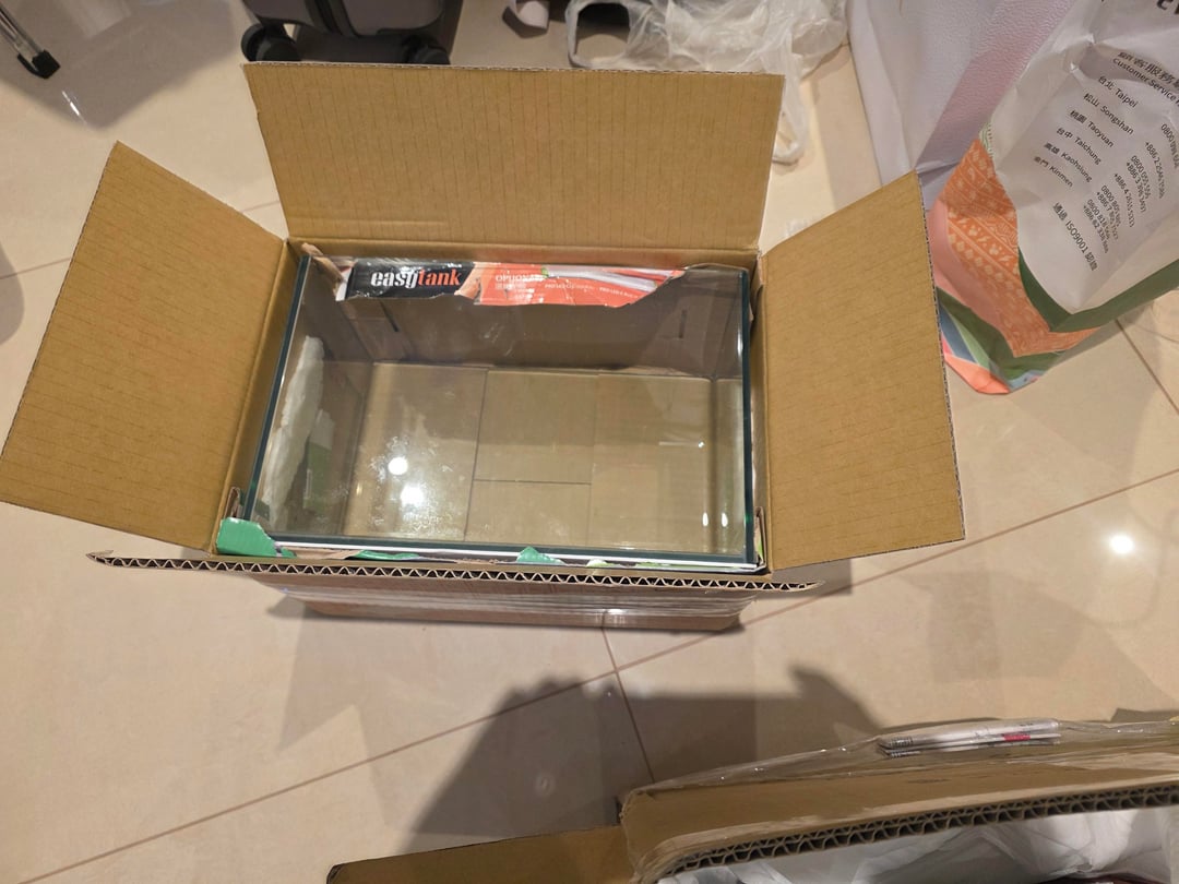 First picture is the larger aquarium with dimension about 45x25x35cm, and 2nd picture is the smaller aquarium 35x20x25cm. I got the box from Carrefour which fit nicely with small space at the side for some foam/sponge as safety cushion. Then I tape them and make a small handle with tape in picture 3.