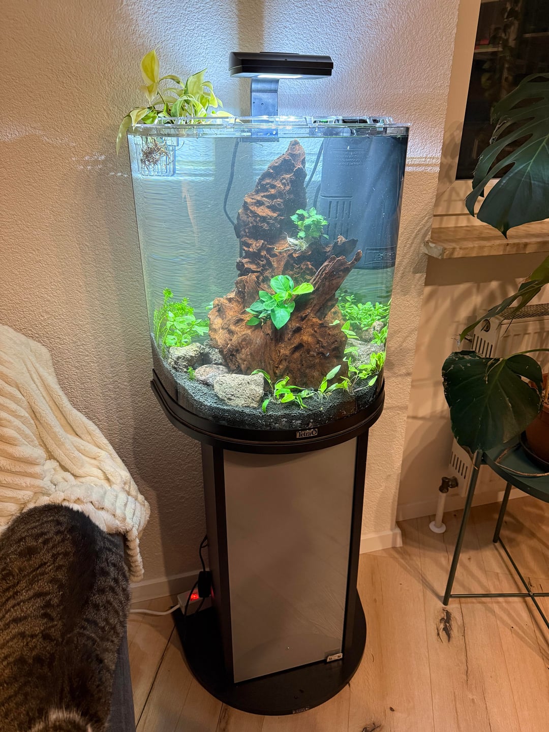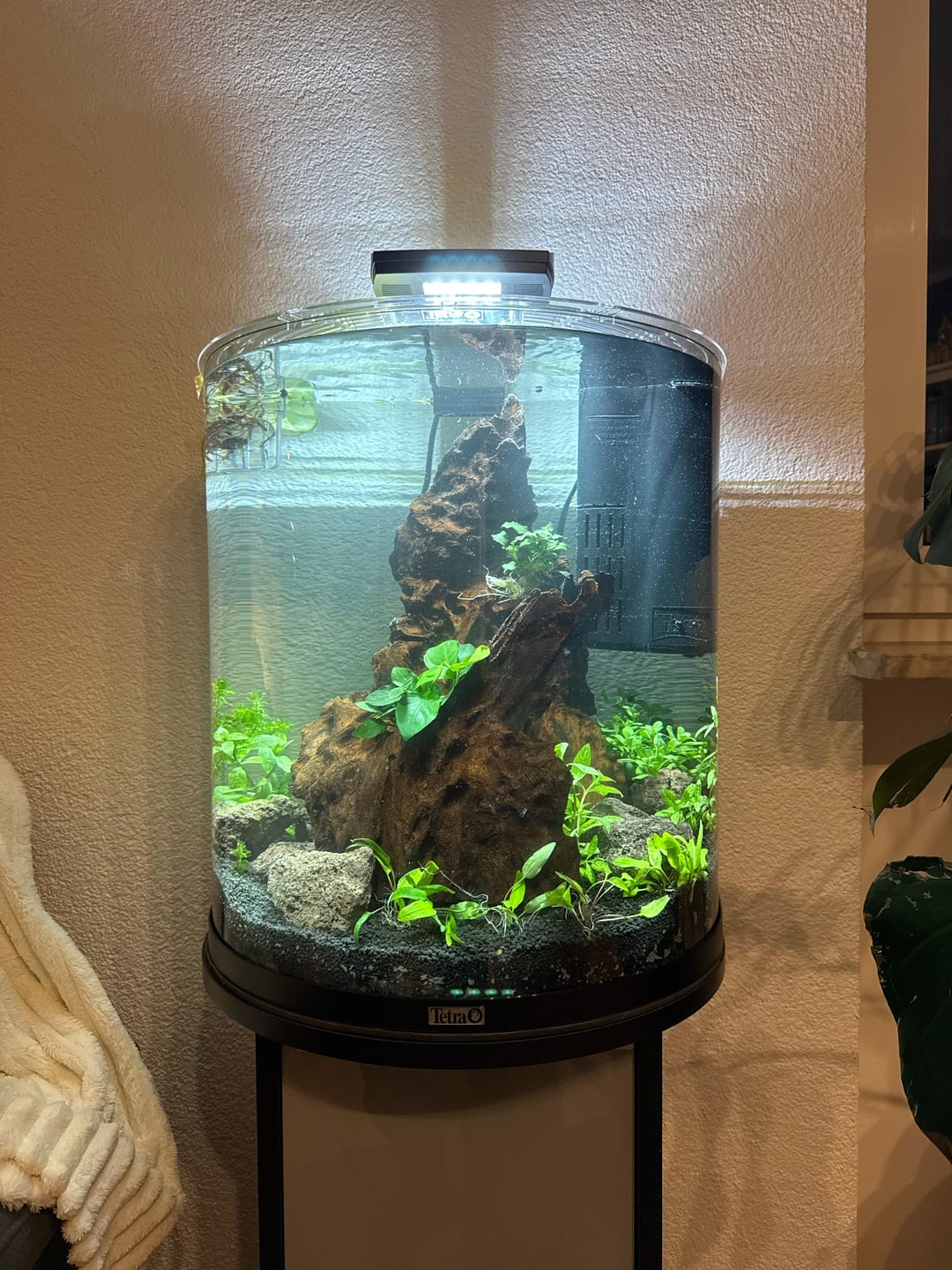 We were thinking of putting in shrimps and maybe a betta or neon tetras. I’d really like a fish that stands out against the green and brown tones of the tank.