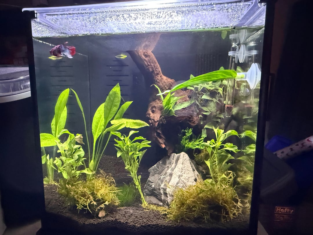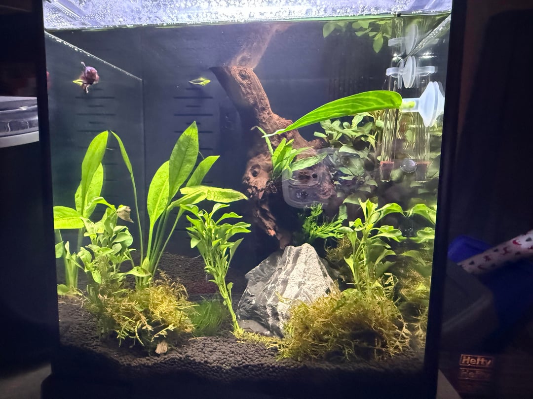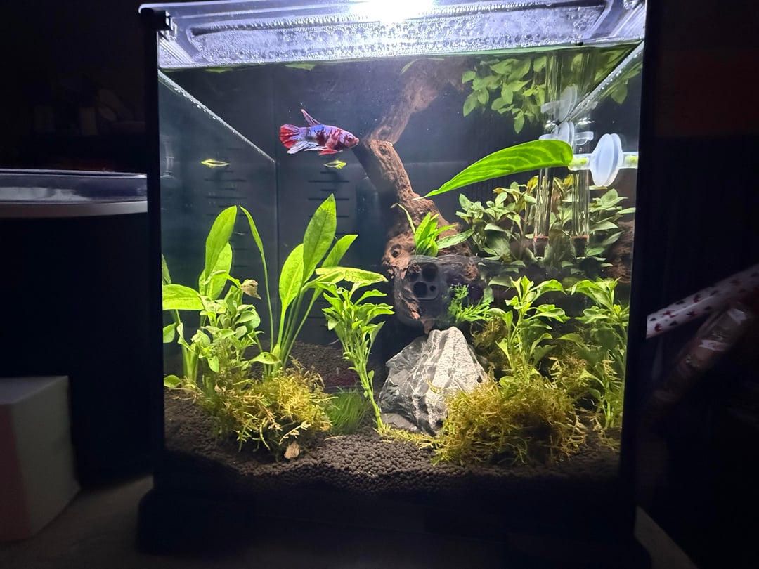 This was when I first put him in💕 he is so much happier now all colorful and his fins look so much better ‼️‼️ this was my first ever "aqua scape" I guess u could call it😭 any recommendations would be nice💕