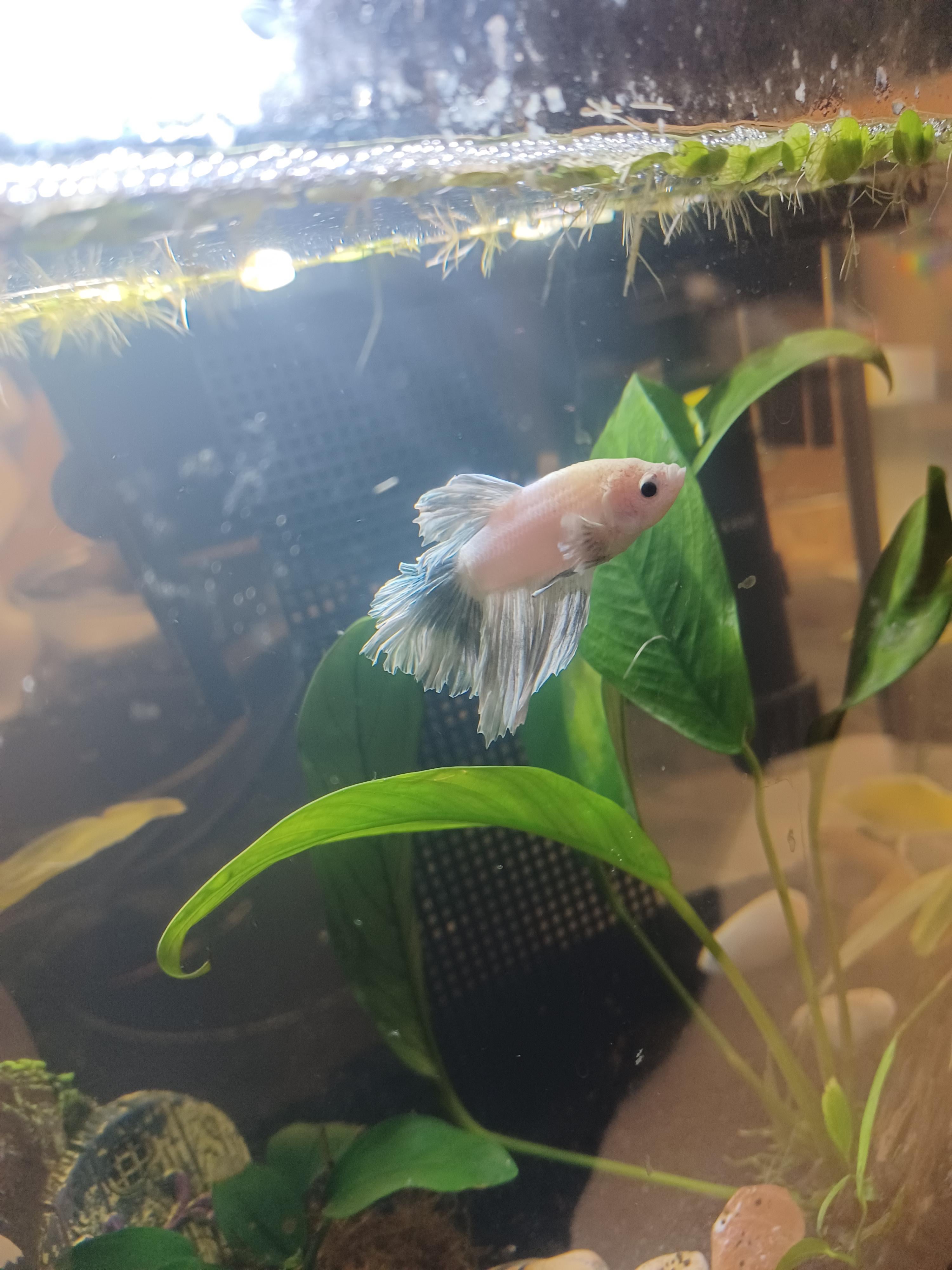 I purchased this white opal betta fish about October of 2025 and I can't tell if his fins are just color change or fin rot?? I just changed some water today so I know he is stressed from that but this has been on him for a few weeks I believe!