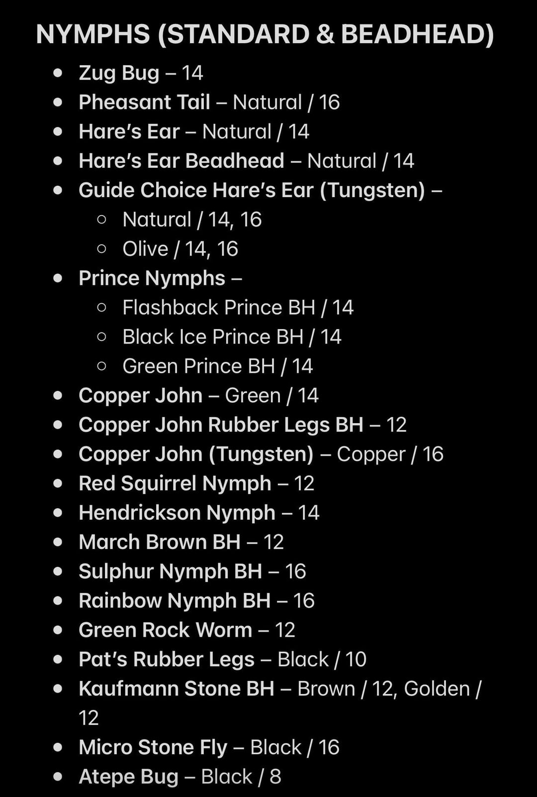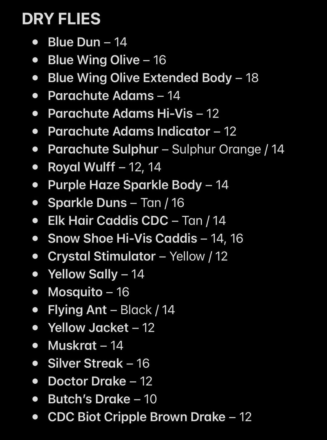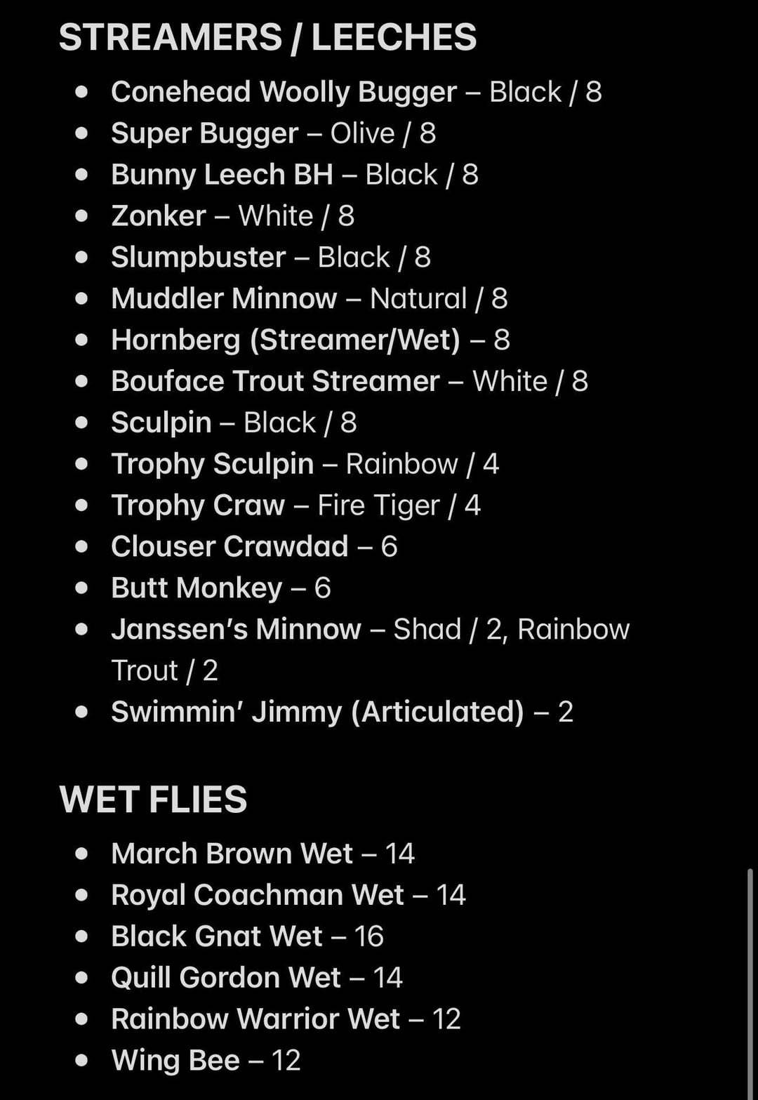 Hey everyone,I put together a list of the flies I currently have. I’m mostly trout fishing and feel pretty good about my box, but I’m sure I’ve got some gaps.