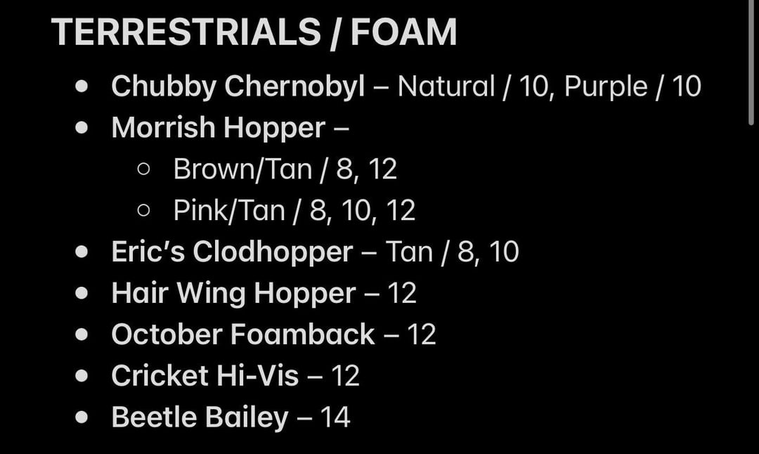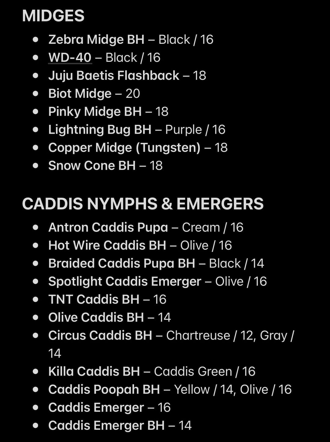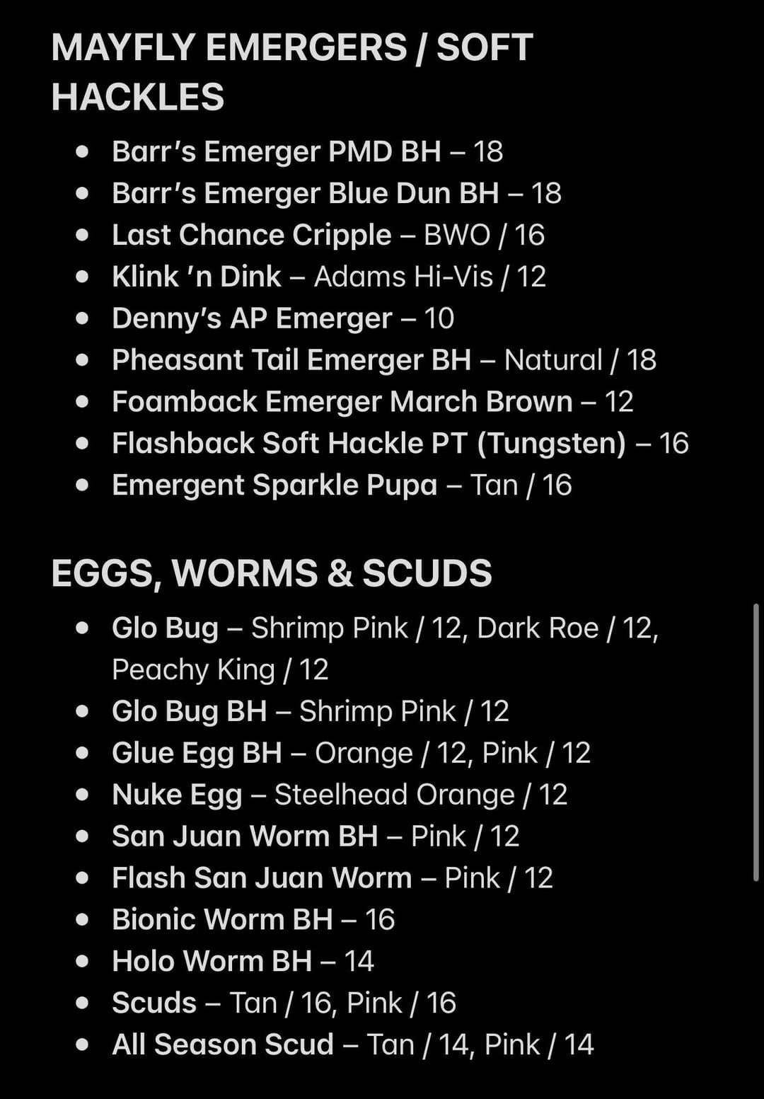 Hey everyone,I put together a list of the flies I currently have. I’m mostly trout fishing and feel pretty good about my box, but I’m sure I’ve got some gaps.