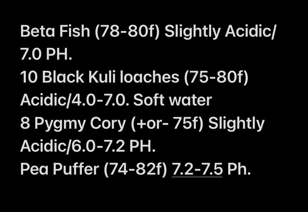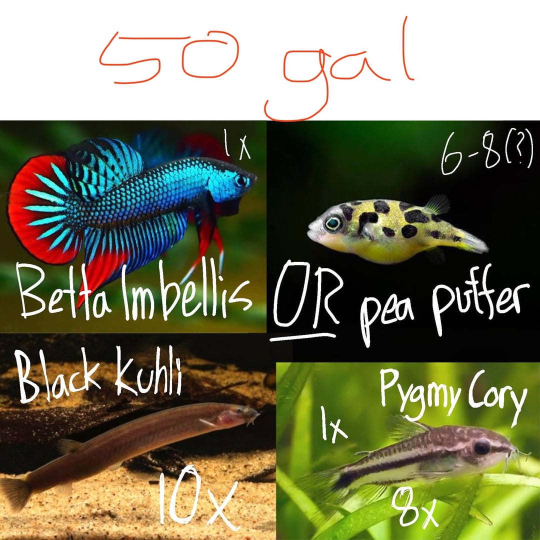 hey! Saw lots of people doing this so I thought I’d make one too, any thoughts or suggestions? I just got a 50gal tank and am working on filling it with plants. Substrate is aqua-soil capped with a thick layer of pool filter sand. I’m trying to decide between pea puffers OR a beta imbellis (apparently more peaceful and non aggressive than other betas) but am leaning towards the beta, even tho I really love puffers, because the puffers seem to require a higher PH than what is ideal for the others, especially Kuli loaches. Correct me if I’m wrong though, I’ve compiled some notes on the second pic that I’ve taken after researching the water parameters needed for these fishes.