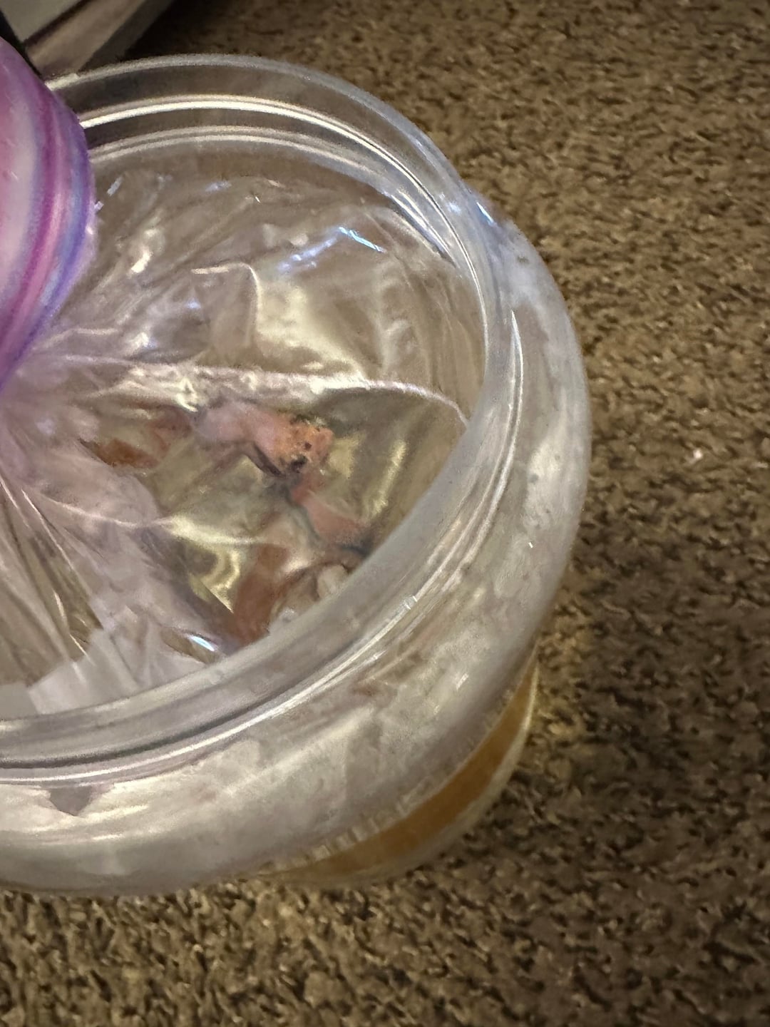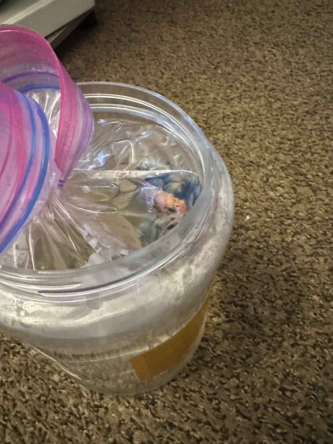 I found that my bettas did much better with a move when they had somewhere to hide. I covered most of the jar with a towel and left a gap open on the side near the top where he could look out if he wanted to. Without the towel he was stressed and frantic and trying to ram the corners of the container. With the towel he was chill and would peek out on occasion. Seemed much less stressed.