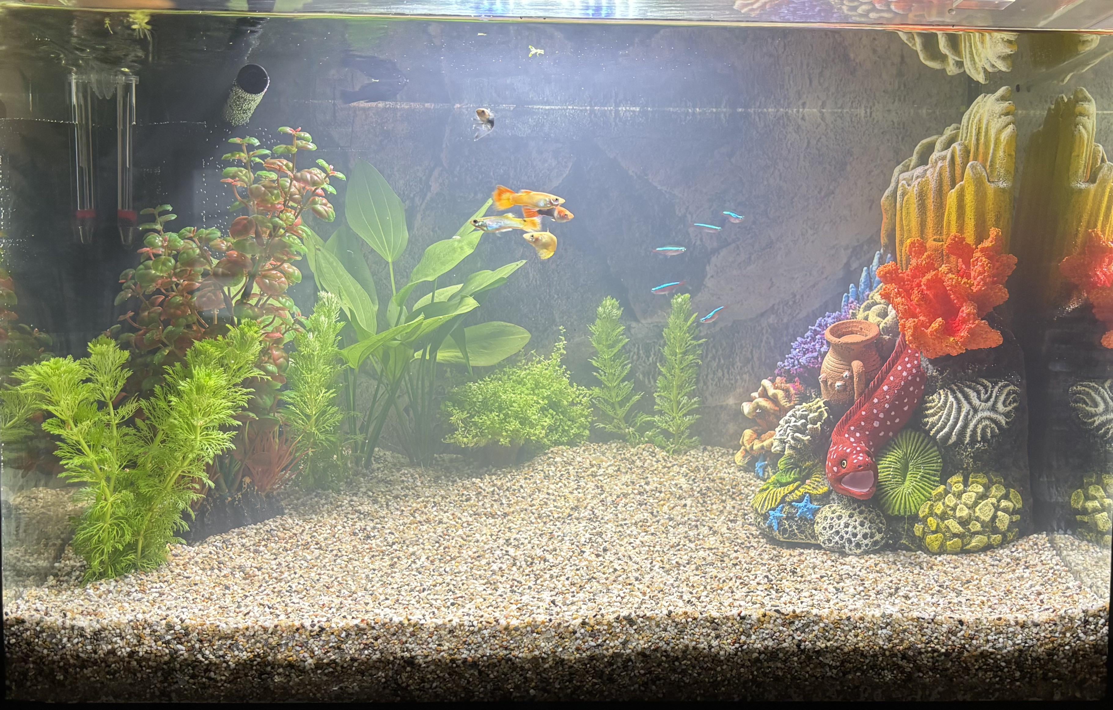 like it, no need for the fake stuff on the right. love the love plants, could add more neon tetras they love to swim around together 🙂