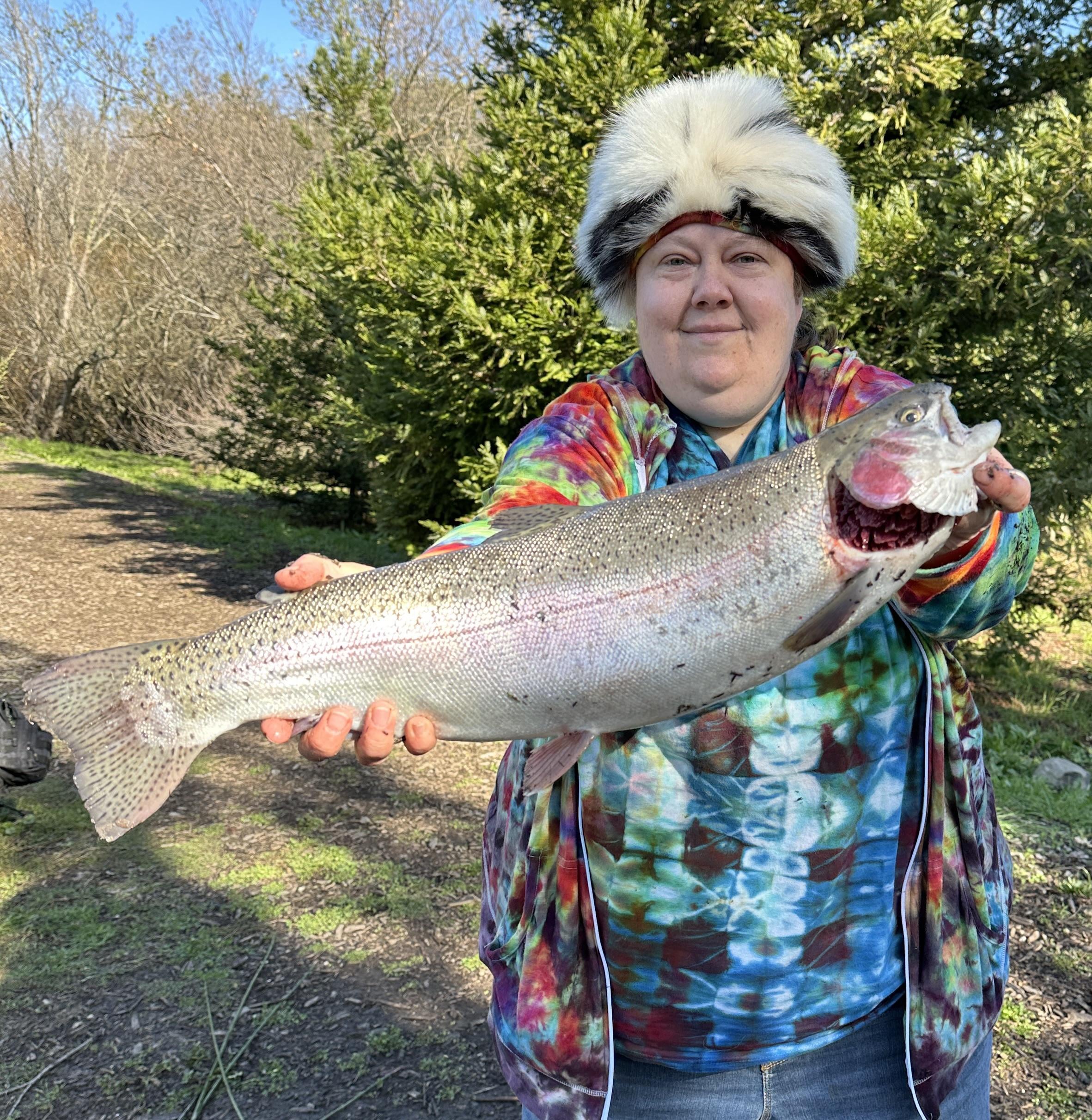 Basic stocked lake, lots of familiar faces out today, some friends shared their BBQ. People all around were catching, but this one corner was holding one thick school of 1-2 lb fish and then was itself surrounded by pars of bigger fish lurking in shadows. After catching two of the easier fish I said OK one more then go home, and started throwing my worm & float closer and more under the lure-eating-willow there. Something kept messing with the worm, thought it was a small bass or bluegill, but it turns out it was this 8 lb beastie. Yes, eight pounds. I weighed it.
