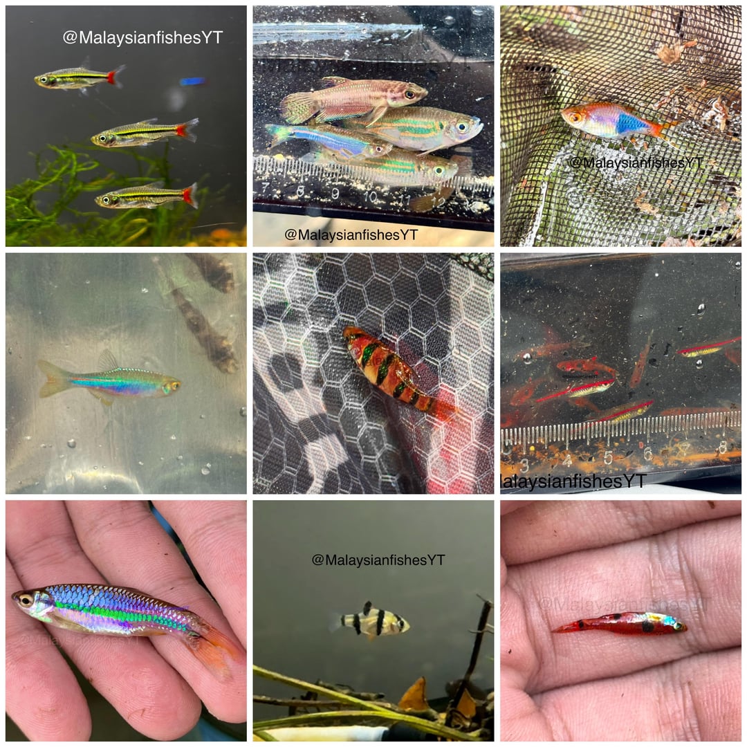 Rasbora borapetensis, Danio tweediei & Devario regina, Trigonostigma truncata, Danio albolineatus, Desmopuntius hexazona, Trigonopoma pauciperforatum, R. einthovenii, Puntigrus partipentazona, Boraras maculatus