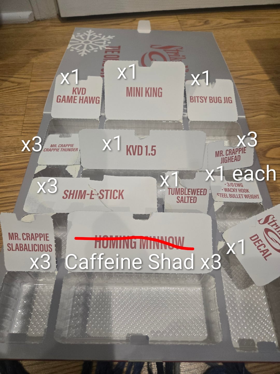 Got a sticker in one slot, 2 hooks in another, and one itty bitty pack of weight stops in another from MTB. I feel like you usually end up with about $30 worth of stuff you might use for every $50 spent on mystery boxes / advent calendars lol