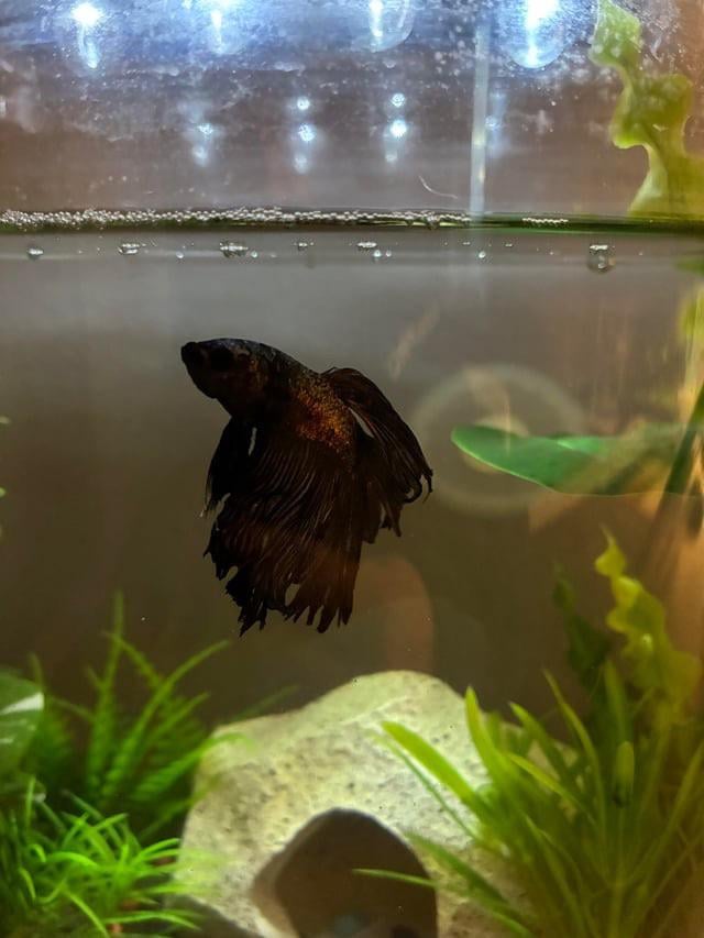 This is Black Mamba (yes like the snake) he’s around 2 or 3 years old, his fins are looking worse for wear, he’s def an old boy. He’s “died” abt 6 times. He’ll lay on the bottom of his tank or on his side or in his rock or whatever and I’m thinking, he’s passed this time. Nope, this little mf starts swimming around again like he’s not the oldest man in the world. I’m convinced he’s immortal. Just wanted to share lol
